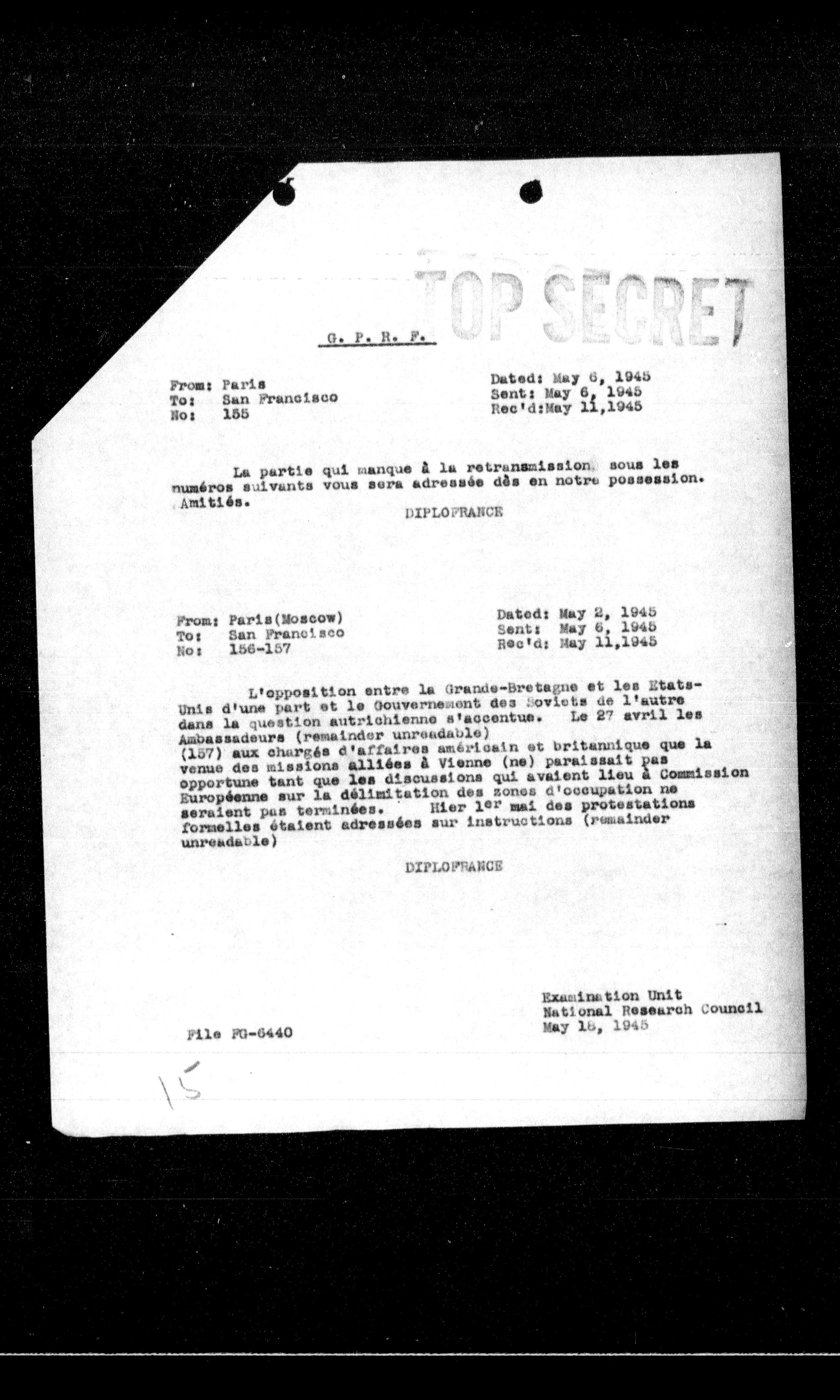 (157) aux charges d'affaires américain et britannique que la venue des missions alliées a Vienne (ne) paraissait pas opportune tant que les discussions qui avaient lieu a Commission Européenne sur la délimitation des zones d'occupation ne seraient pas terminées. Hier $1^{\text {er }}$ mal des protestations formelles étaient adressées sur instructions (remainder unreadable)