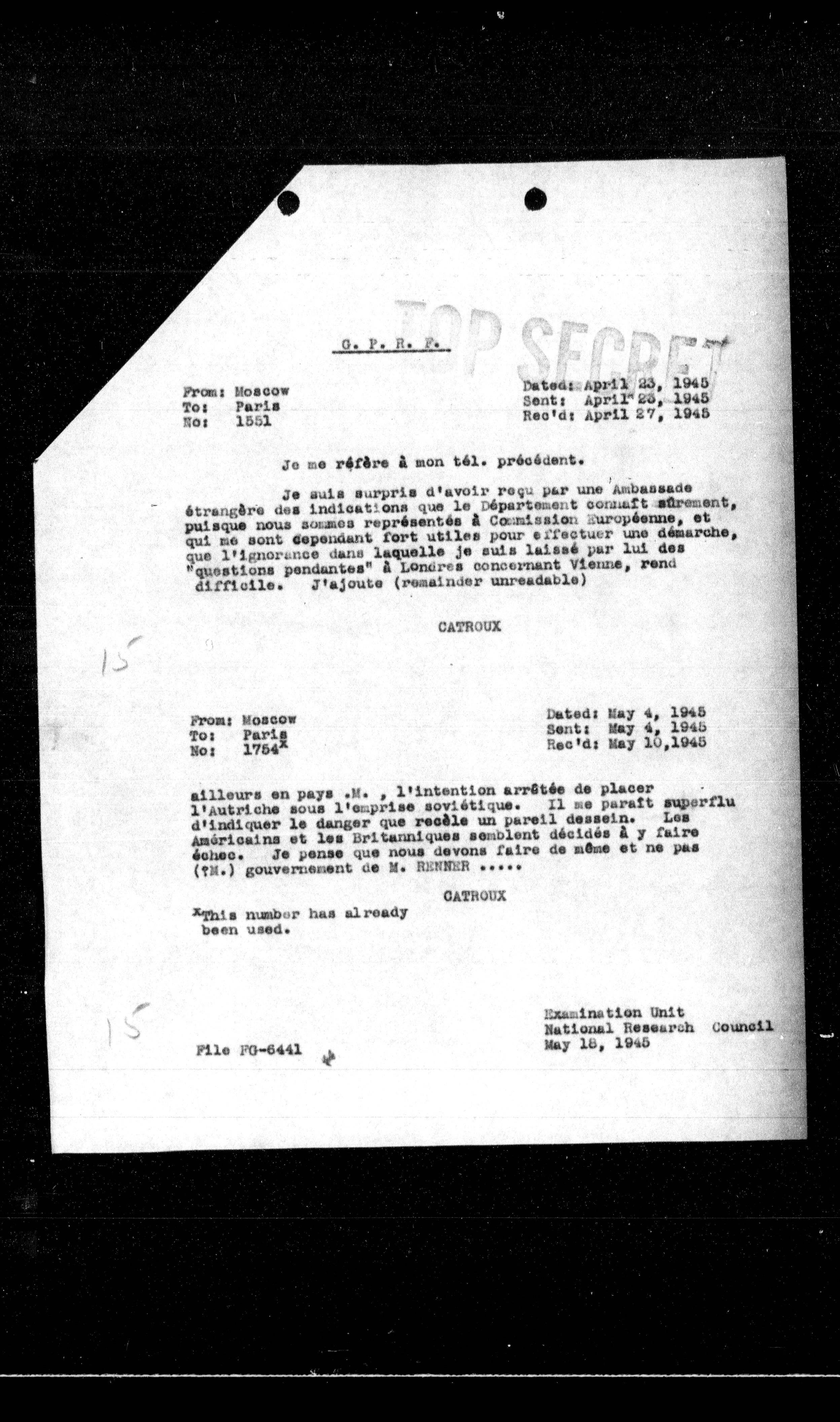 l'Autriche sous l'emprise soviétique. Il me parait superflu d'indiquer le danger que recèle un pareil dessein. Les Américains et les Britanniques semblent décidés à y faire échec. Je pense que nous devons faire de même et ne pas (T.R.) gouvernement de M. RENNER .....