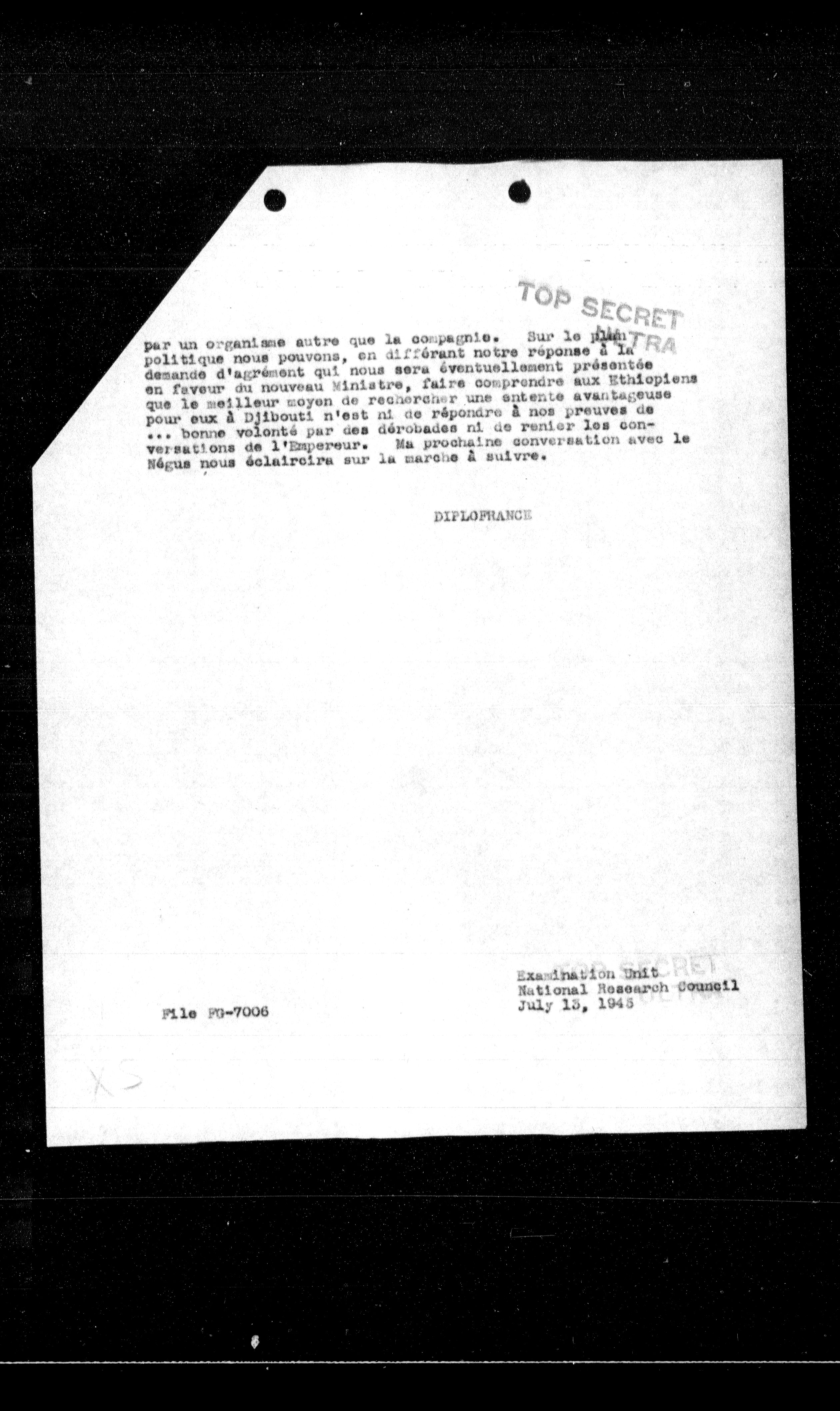 par un organisme autre que la compagnie. Sur le plan politique nous pouvons, en différant notre réponse à la demande d'agrément qui nous sera éventuellement présentée en faveur du nouveau Ministre, faire comprendre aux Ethiopiens que le meilleur moyen de rechercher une entente avantageuse pour eux à Djibouti n'est ni de répondre à nos preuves de bonne volonté par des dérobades ni de renier les conversations de l'Empreure. Ma prochaine conversation avec le Régus nous éclairera sur la marche à suivre.