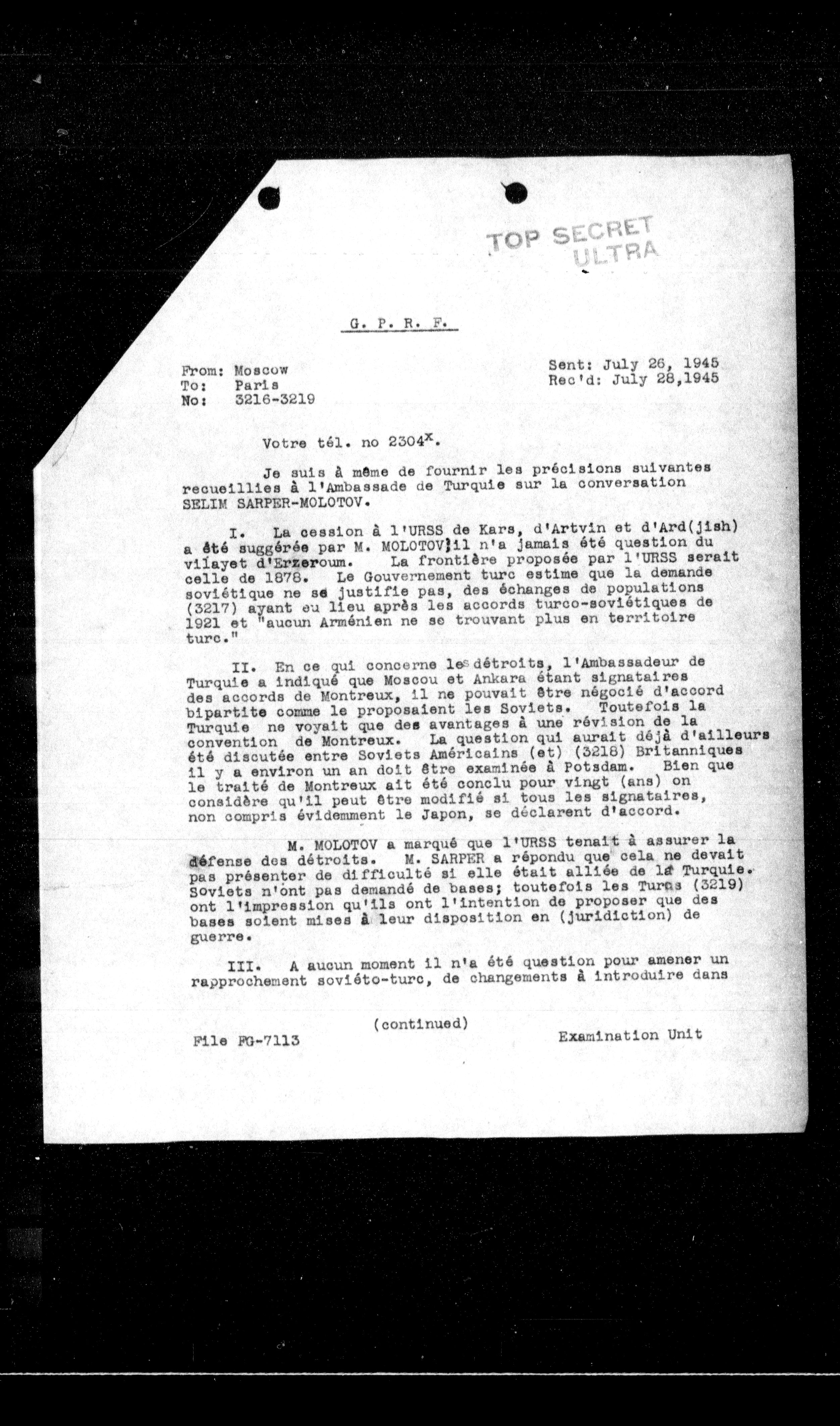 I. La cession à l'URSS de Kars, d'Artvin et d'Ard(jish) a été suggérée par M. MOLOTOV|il n'a jamais été question du vilayet d'Erzeroum. La frontière proposée par l'URSS serait celle de 1878. Le Gouvernement turc estime que la demande soviétique ne se justifie pas, des échanges de populations (3217) ayant eu lieu après les accords turco-soviétiques de 1921 et "aucun Arménien ne se trouvant plus en territoire turc."