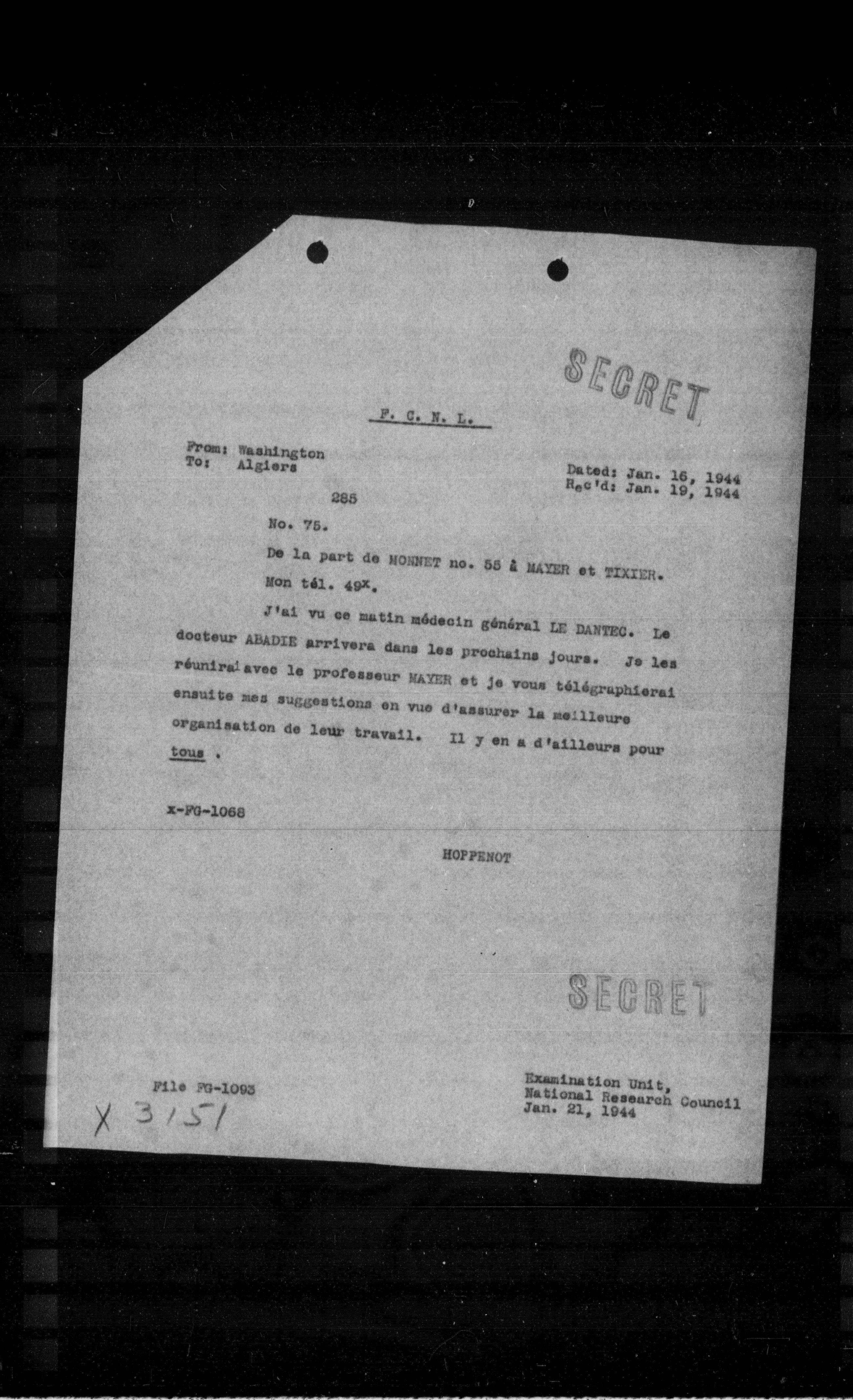 J'ai vu ce matin médecin général LE DANTEC. Le docteur ABADIE arrivera dans les prochains jours. Je les réunira' avec le professeur MAYER et je vous télégraphierai ensuite mes suggestions on vue d'assurer la meilleure organisation de leur travail. Il y en a d'ailleurs pour tous .