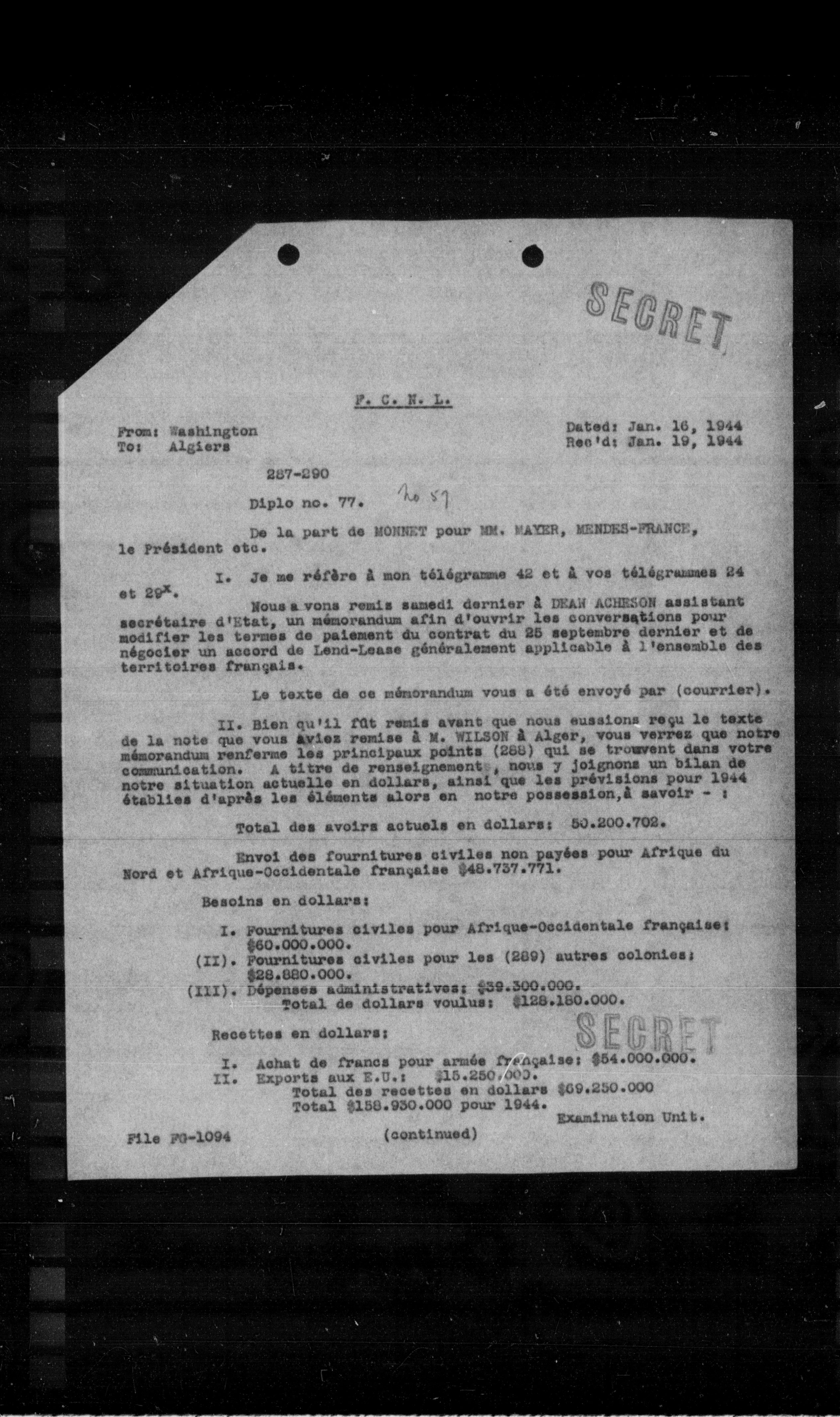 II. Bien qu'il fût remis avant que nous suscitons reçu le texte de la note que vous aviez remise à M. WILSON à Alger, vous verrez que notre mémorandum renferme les principaux points (288) qui se trouvent dans votre communication. À titre de renseignements, nous 7 joignons un bilan de notre situation actuelle en dollars, ainsi que les prévisions pour 1944 établies d'après les éléments alors en notre possession, à savoir :