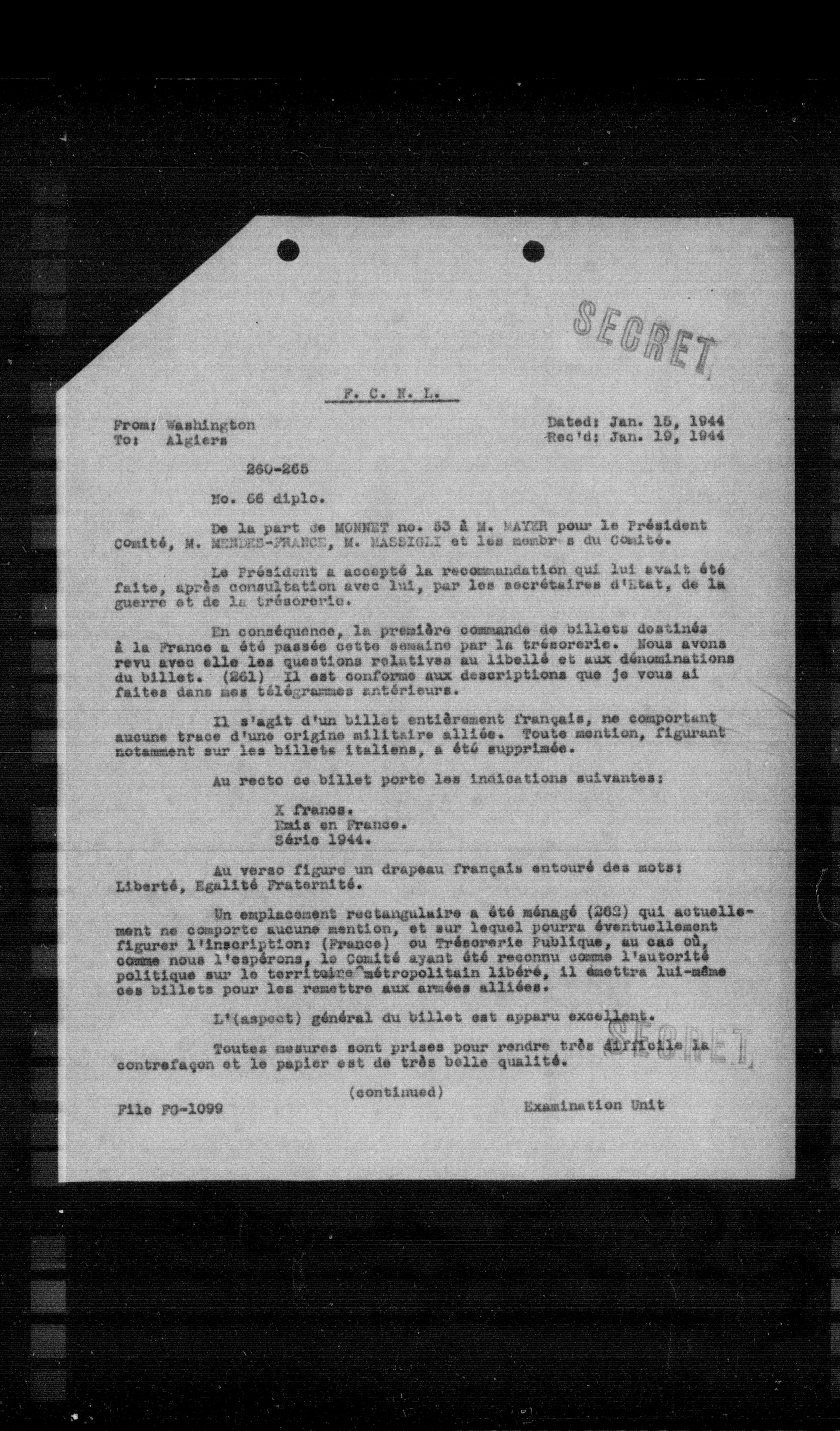 Un emplacement rectangulaire a été ménagé (262) qui actuellement ne comporte aucune mention, et sur lequel pourra éventuellement figurer l'inscription: (France) ou Trésorerie Publique, au cas où, comme nous l'espérons, le Comité ayant été reconnu comme l'autorité politique sur le territoire métropolitain libéré, il émettra lui-même ces billets pour les remettre aux armées alliées.