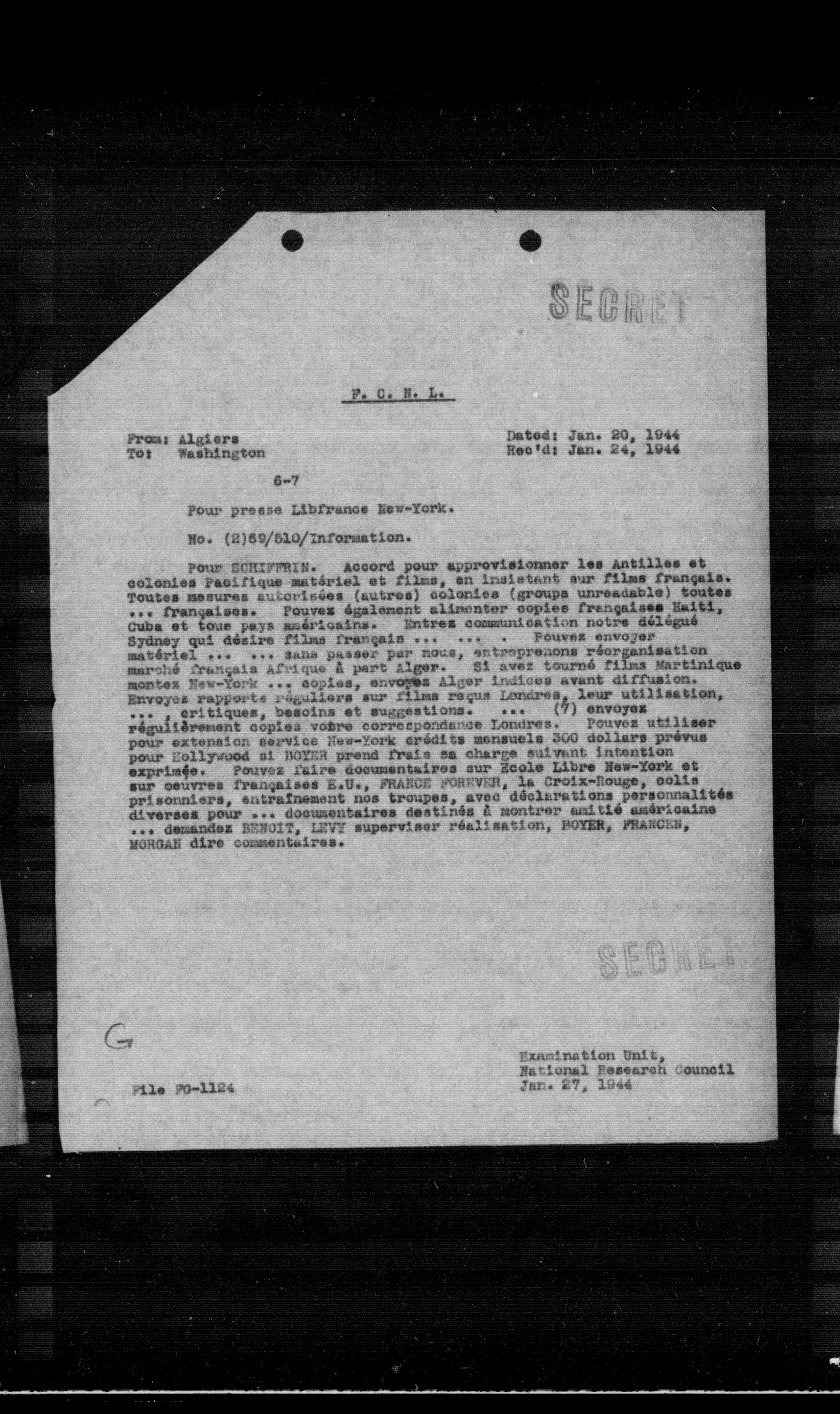 Pour SCHIFFRIN. Accord pour approvisionner les Antilles et colonies Pacifique matériel et films, en insistant sur films français. Toutes mesures autorisées (autres) colonies (groupe unreadable) toutes ... françaises. Pouvez également alimenter copies françaises Haiti, Cuba et tous pays américains. Entrez communication notre délégué Sydney qui désire films français ... Pouvez envoyer matériel ... sans passer par nous, entrepreneurs réorganisation marché français Afrique à part Alger. Si avez tourné films Martinique montés New-York ... copies, envoyés Alger indices avant diffusion. Envoyez rapports réguliers sur films reçus Londres, leur utilisation, ... critiques, besoins et suggestions. (?) envoyez régulièrement copies votre correspondance Londres. Pouvez utiliser pour extension service New-York crédits mensuels 300 dollars prévus pour Hollywood si ROYER prend frais sa charge suivant intention exprimée. Pouvez faire documentaires sur Scole Libre New-York et sur œuvres françaises E.U., FRANCE FOREVER, la Croix-Rouge, colis prisonniers, entraînement nos troupes, avec déclarations personnelles diverses pour ... documentaires destinés à montrer amitié américaine ... demandez BENOIT, LEVY superviser réalisation, ROYER, FRANCIS, MORGAN dire commentaires.