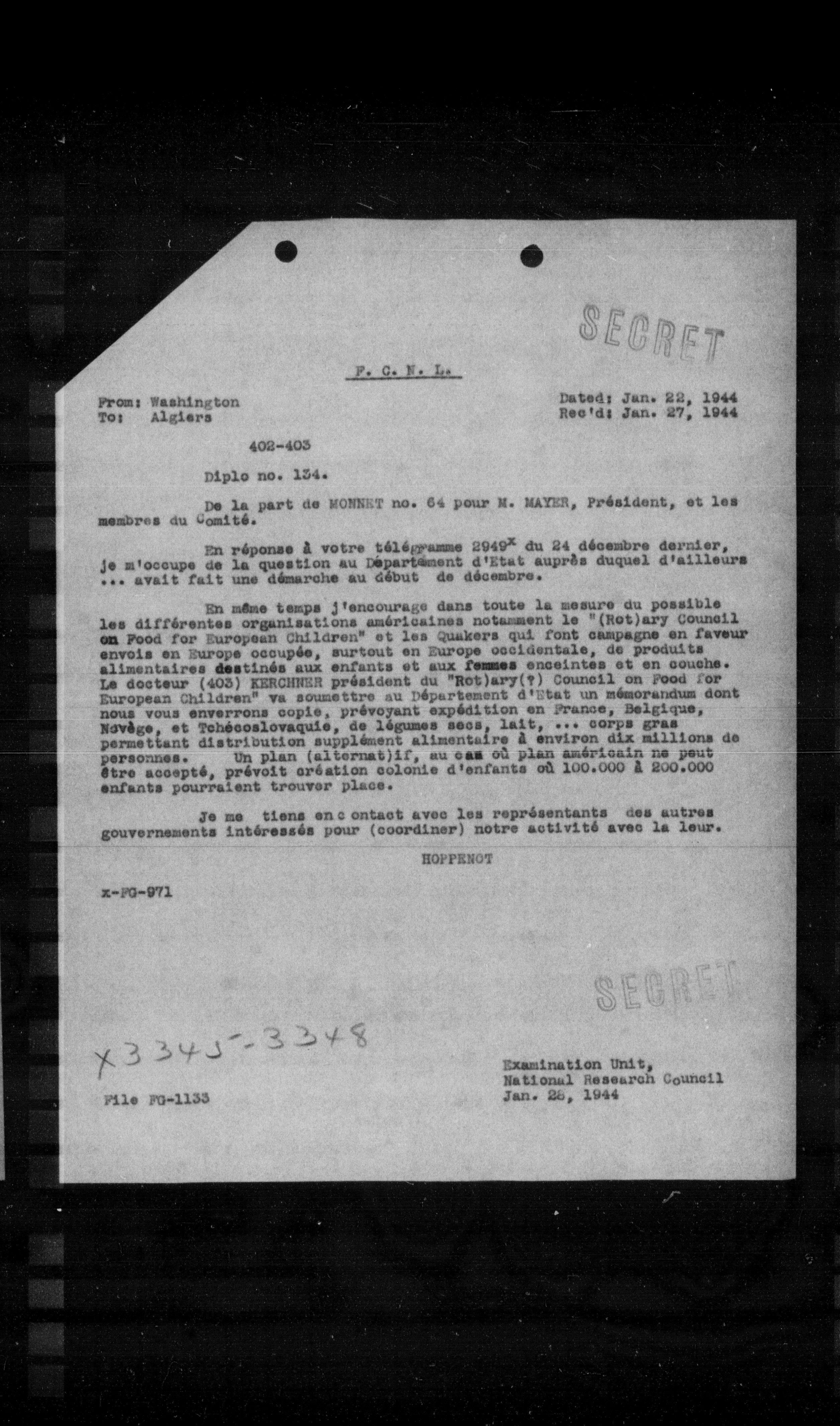 En même temps j'encourage dans toute la mesure du possible les différentes organisations américaines notamment le "(Not)ary Council on Food for European Children" et les Quakers qui font campagne en faveur envois en Europe occupée, surtout en Europe occidentale, de produits alimentaires destinés aux enfants et aux fennes enceintes et en oouahe. Le docteur (402) KERCHNER président du "Not)ary(?) Council on Food for European Children" va soumettre au Département d'Etat un mémorandum dont nous vous enverrons copie, prévoyant expédition en France, Belgique, Novêge, et Tchécoslovaquie, de légumes secs, lait, ... corps gras permettant distribution supplément alimentaire à environ dix millions de personnes. Un plan (alternat)if, au cas où plan américain ne peut être accepté, prévoit création colonie d'enfants o8 100.000 à 200.000 enfants pourraient trouver place.