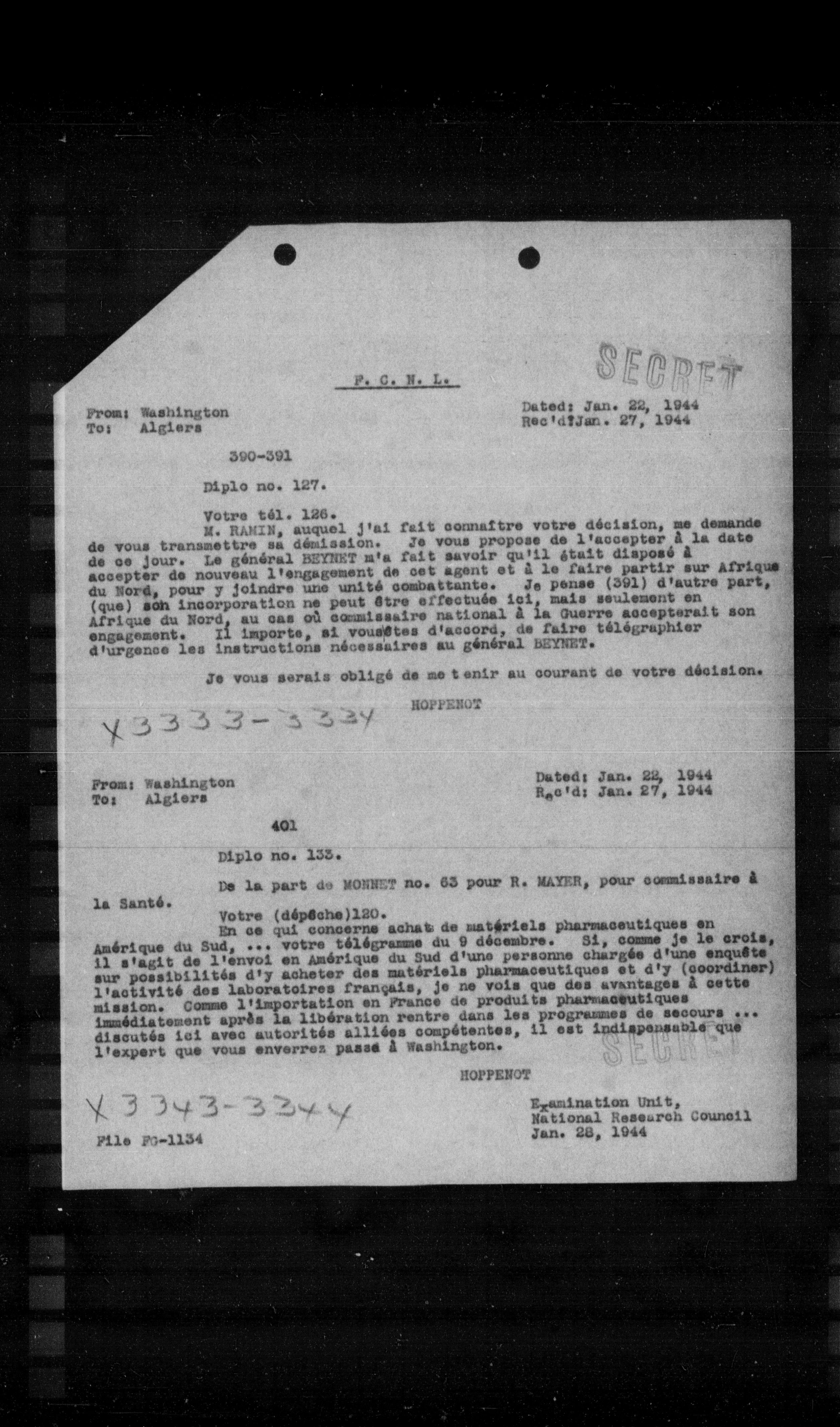 M. RAKIN, auquel j'ai fait connaître votre décision, me demande de vous transmettre sa démission. Je vous propose de l'accepter à la date de ce jour. Le général BEYNET m'a fait savoir qu'il était disposé à accepter de nouveau l'engagement de cet agent et à le faire partir sur Afrique du Nord, pour y joindre une unité combattante. Je pense (391) d'autre part, (que) son incorporation ne peut être effectuée ici, mais seulement en Afrique du Nord, au cas où commissaire national à la Guerre accepterait son engagement. Il importe, si vous êtes d'accord, de faire télégraphier d'urgence les instructions nécessaires au général BEYNET.