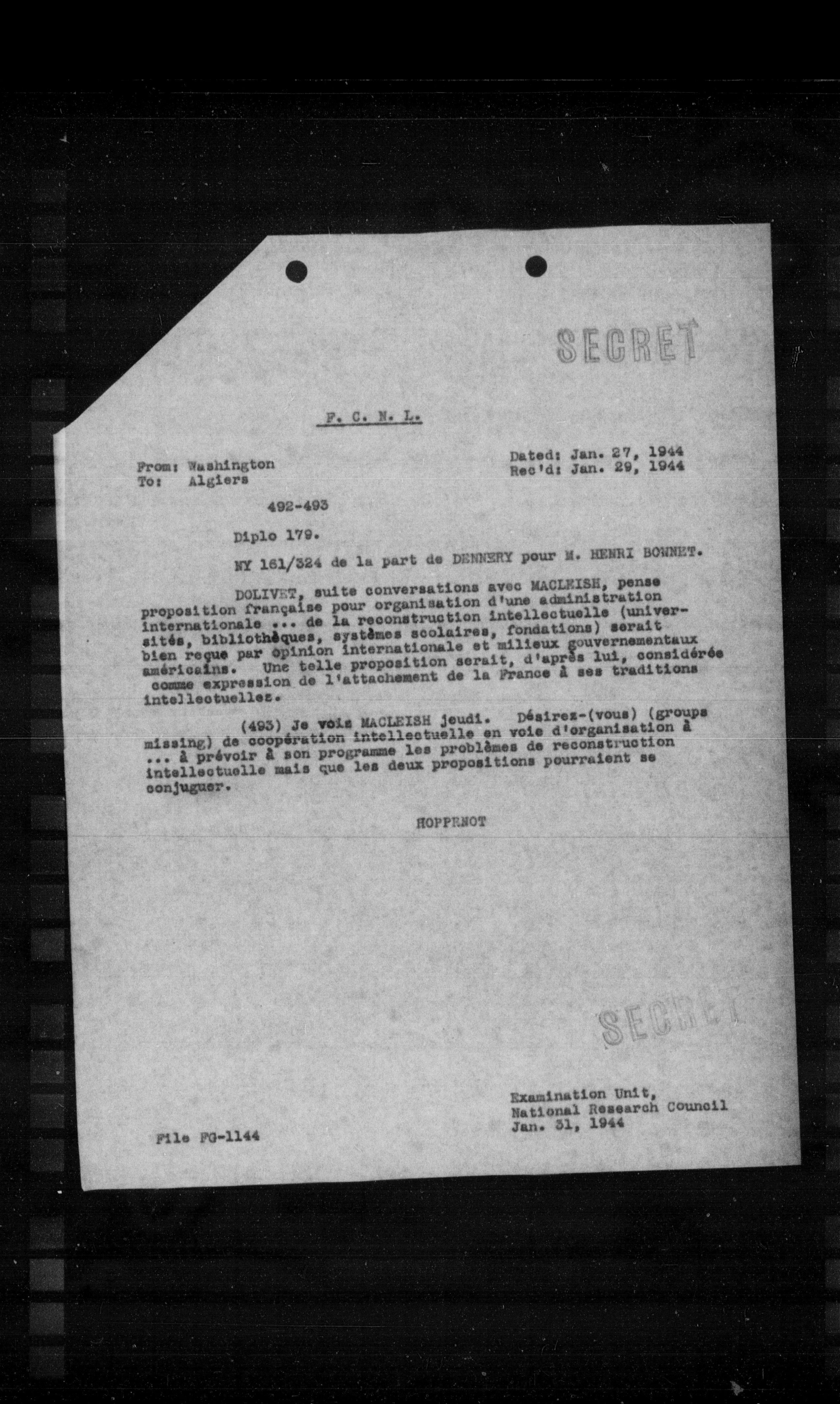 (493) Je vois MACLEISH jeudi. Désirez-(vous) (groupe missing) de coopération intellectuelle en voie d'organisation a ... à prévoir à son programme les problèmes de reconstruction intellectuelle mais que les deux propositions pourraient se conjuguer.