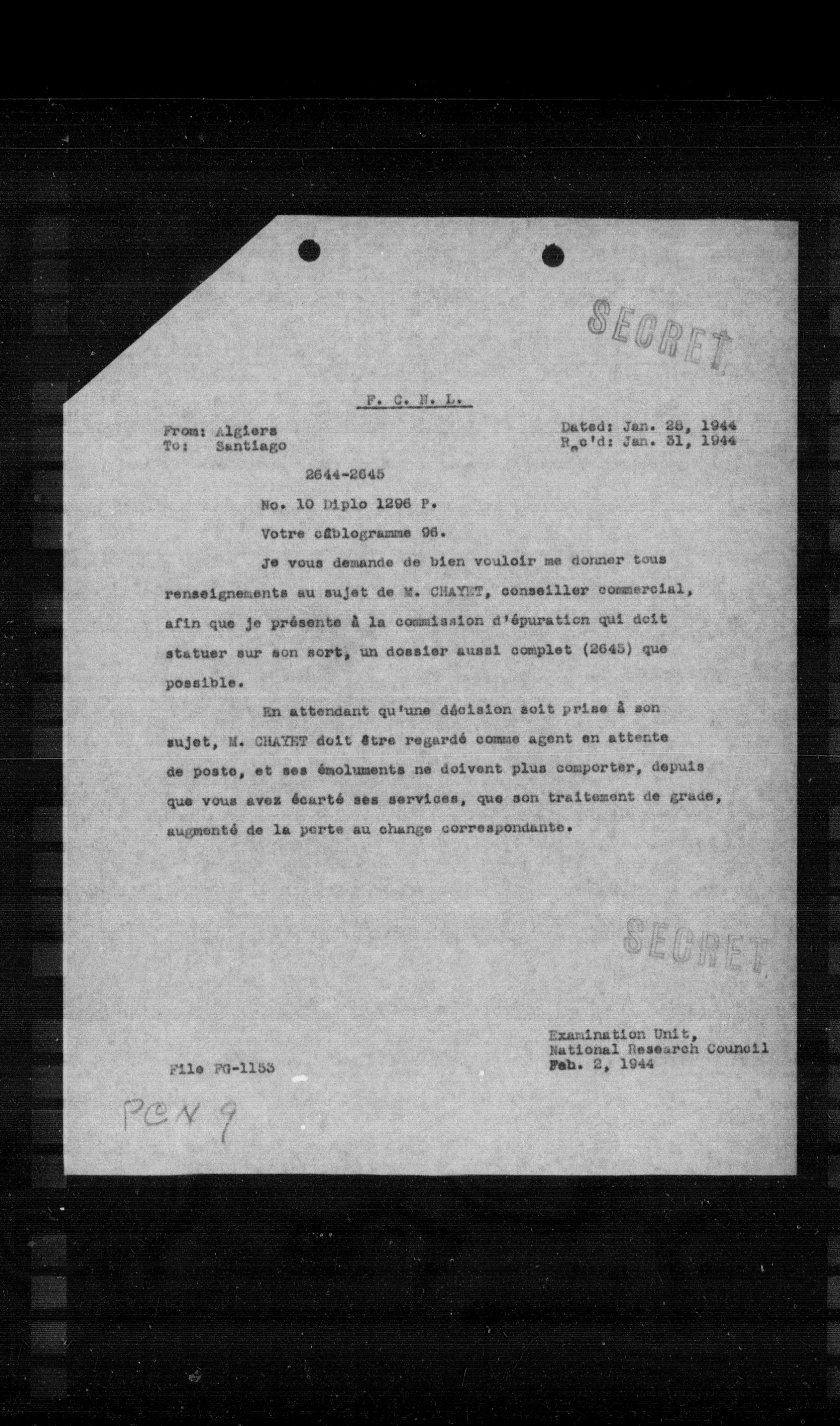 Je vous demande de bien vouloir me donner tous renseignements au sujet de M. CHAYET, conseiller commercial, afin que je présente à la commission d'épuration qui doit statuer sur son sort, un dossier aussi complet (2645) que possible.