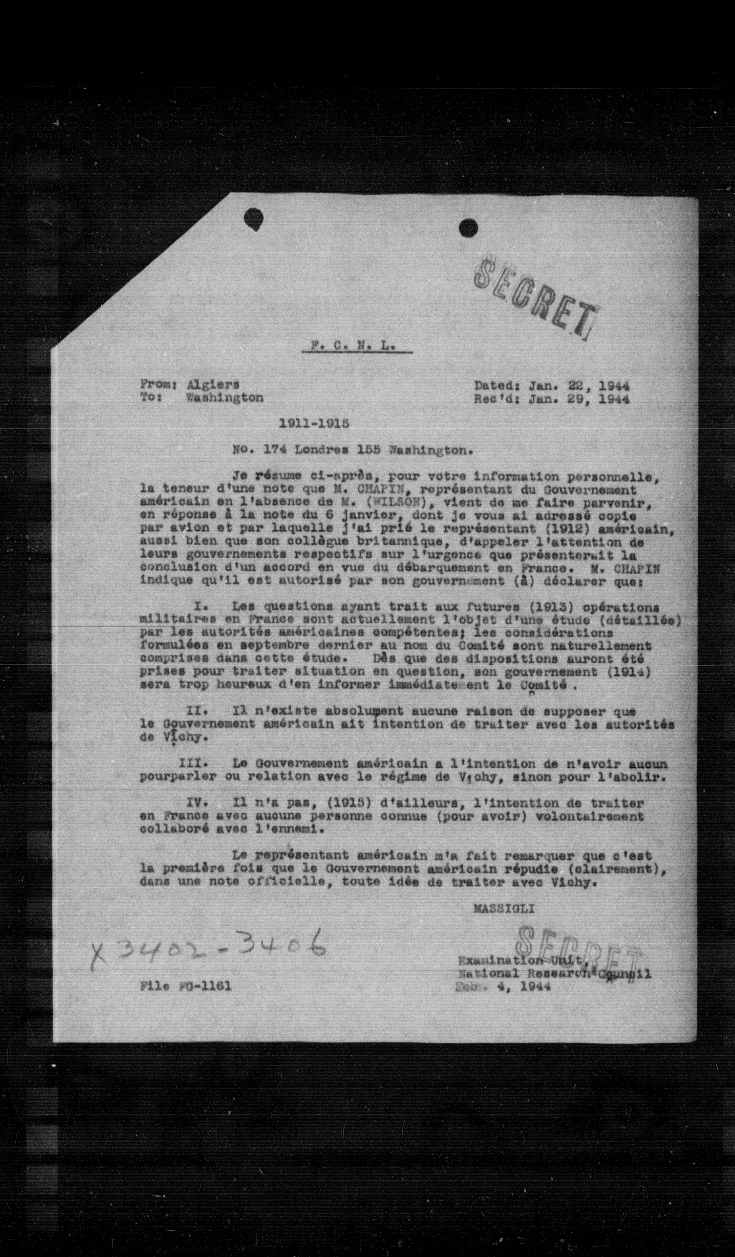 Je résume ci-après, pour votre information personnelle, la teneur d'une note que N. CHAPIN, représentant du Gouvernement américain en l'absence de N. (WILSON), vient de me faire parvenir, en réponse à la note du 6 janvier, dont je vous ai adressé copie par avion et par laquelle j'ai prié le représentant (1912) américain, aussi bien que son collègue britannique, d'appeler l'attention de leurs gouvernements respectifs sur l'urgence que présenterait la conclusion d'un accord en vue du débarquement en France. N. CHAPIN indique qu'il est autorisé par son gouvernement (à) déclarer que: