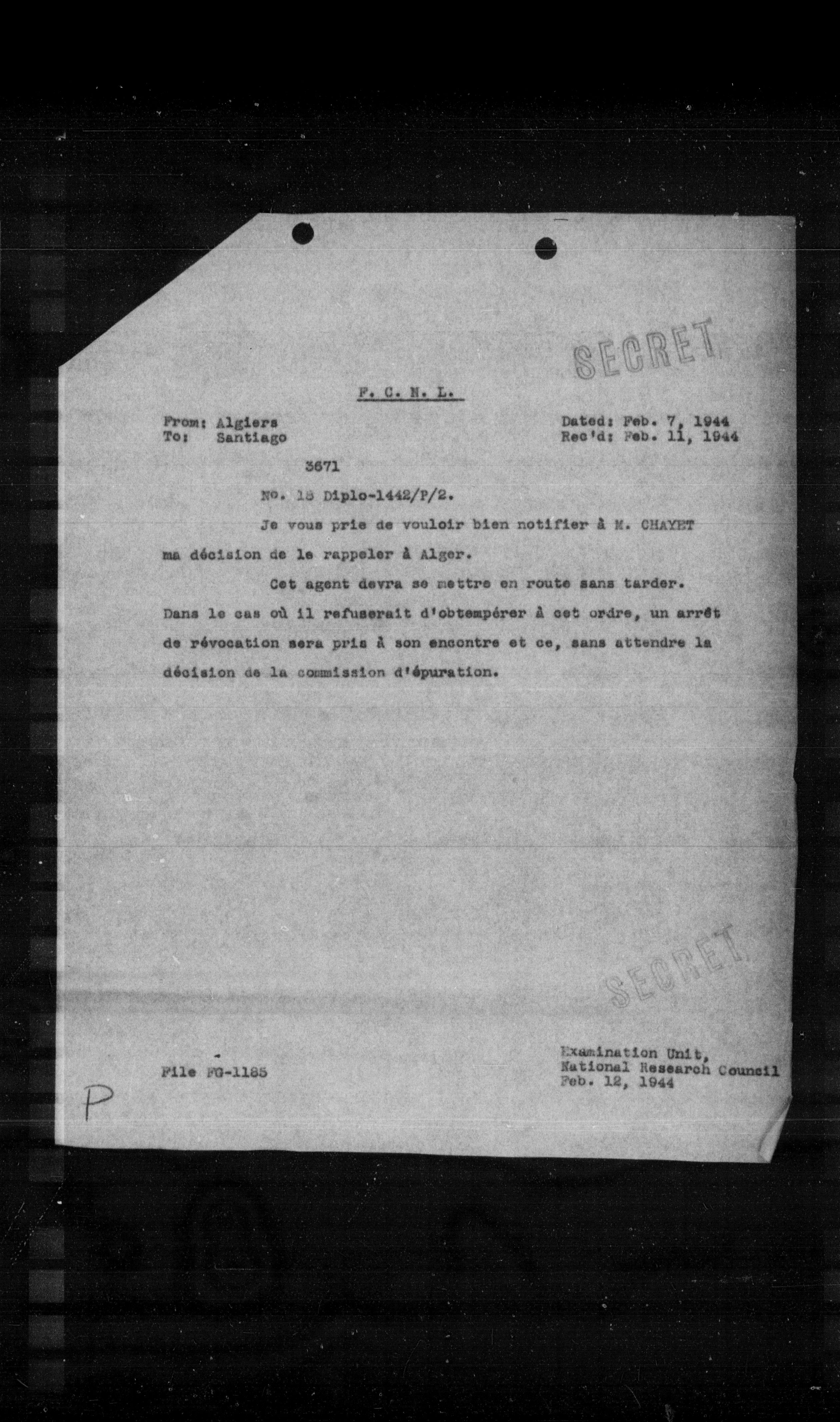 Je vous prie de vouloir bien notifier a K. CHAYET ma décision de le rappeler à Alger.