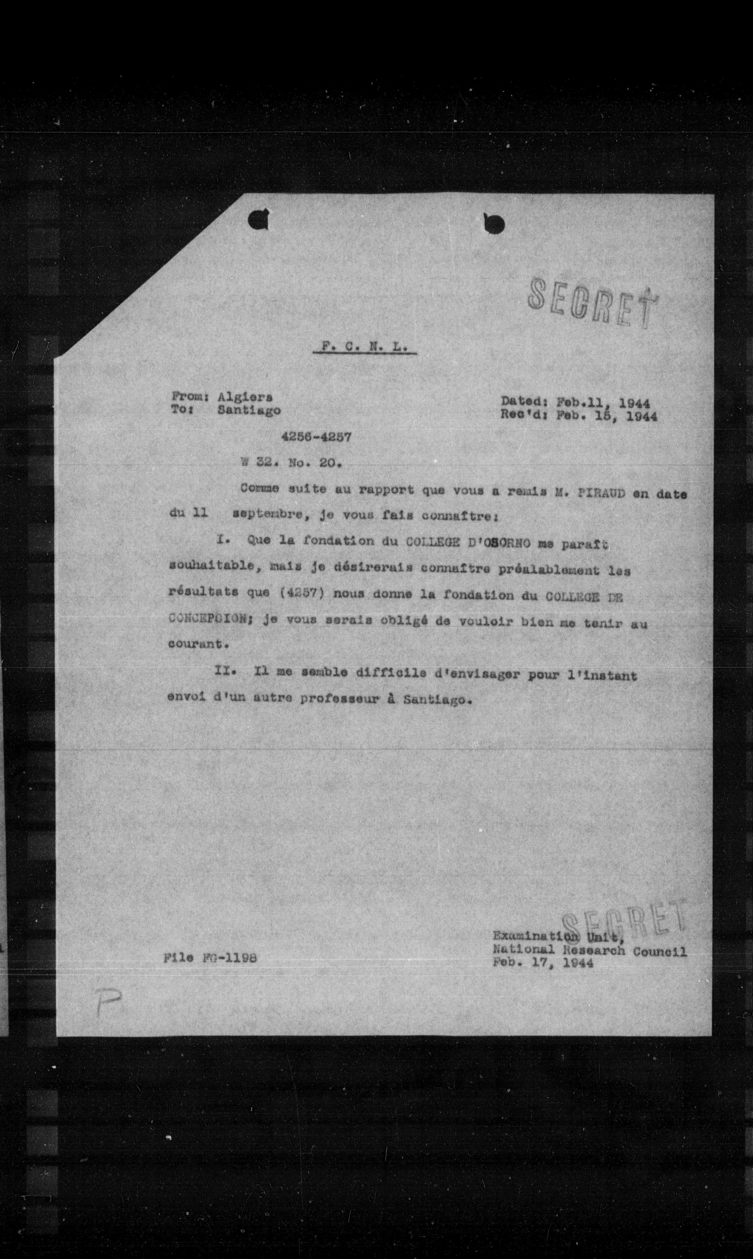 II. Il me semble difficile d'envisager pour l'instant envoi d'un autre professeur à Santiago.