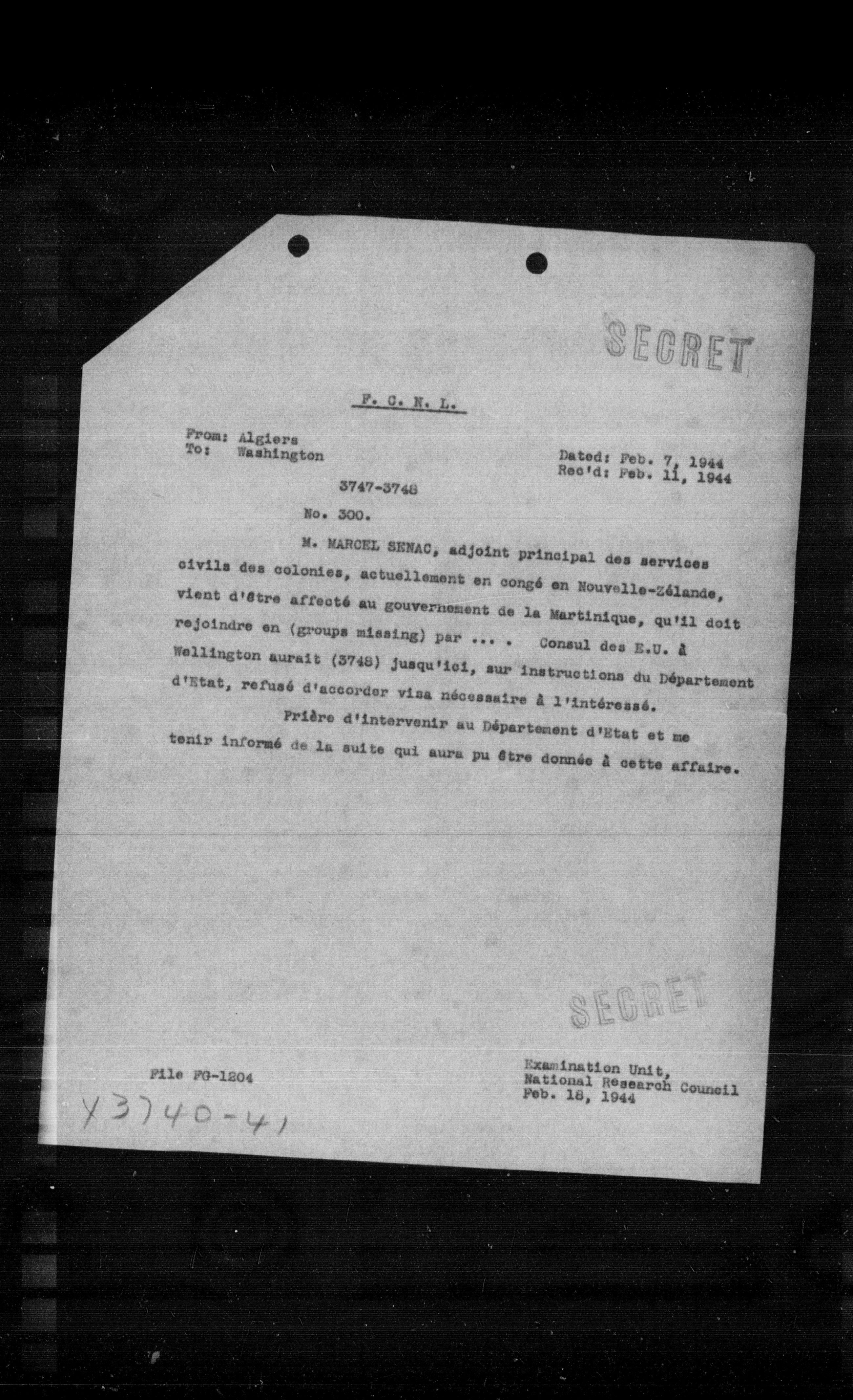 M. MARCEL SENAC, adjoint principal des services civils des colonies, actuellement en congé en Nouvelle-Zélande, vient d'être affecté au gouvernement de la Martinique, qu'il doit rejoindre en (groups missing) par ... . Consul des E.U. a Wellington aurait (3748) jusqu'ici, sur Instructions du Département d'Etat, refusé d'accorder visa nécessaire à l'intéressé.
