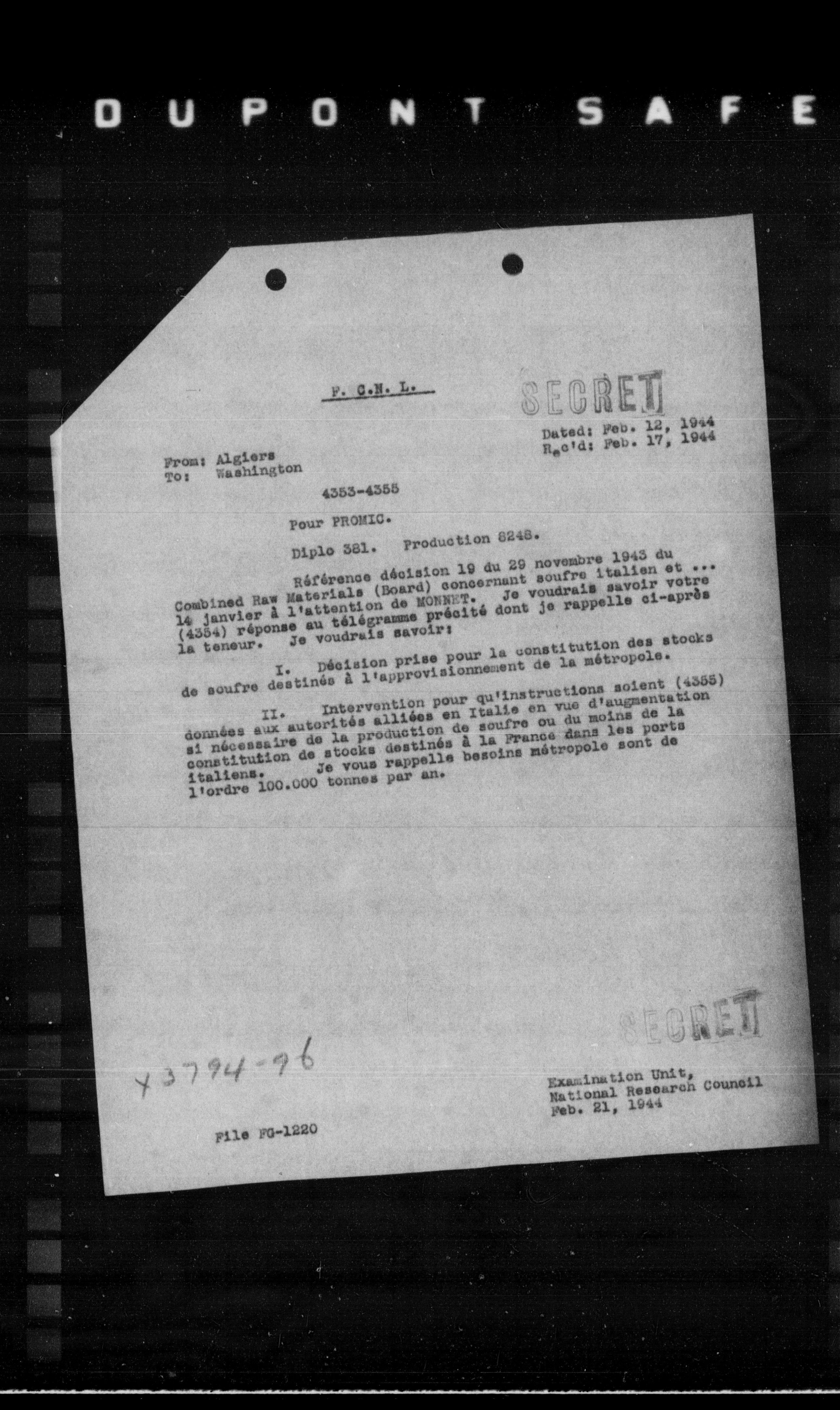 Référence décision 19 du 29 novembre 1943 du Combined Raw Materials (Board) concernant soufre italien et ... le janvier à l'attention de MONEY. Je voudrais savoir votre (4354) réponse au téléphone précité dont je rappelle ci-après la teneur. Je voudrais savoir:
