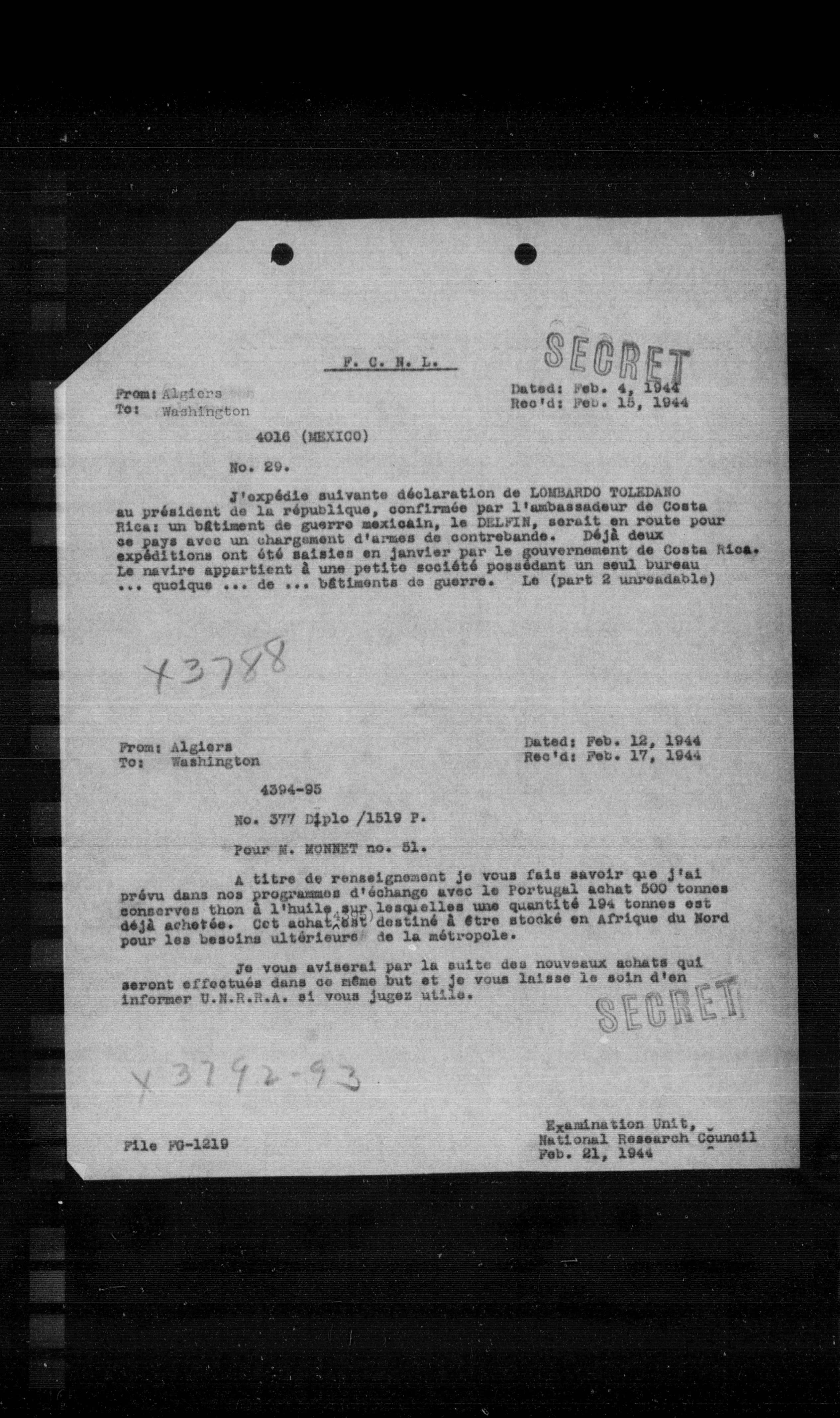 au président de la république, confirmée par l'ambassadeur de Costa Rica: un batiment de guerre mexicain, le DELFIN, serait en route pour ce pays avec un chargement d'armes de contrebande. Déja deux expéditions ont été saisies en janvier par le gouvernement de Costa Rica. Le navire appartient à une petite société possédant un seul bureau ... quoique ... de ... bâtiments de guerre. Le (part 2 unreadable)