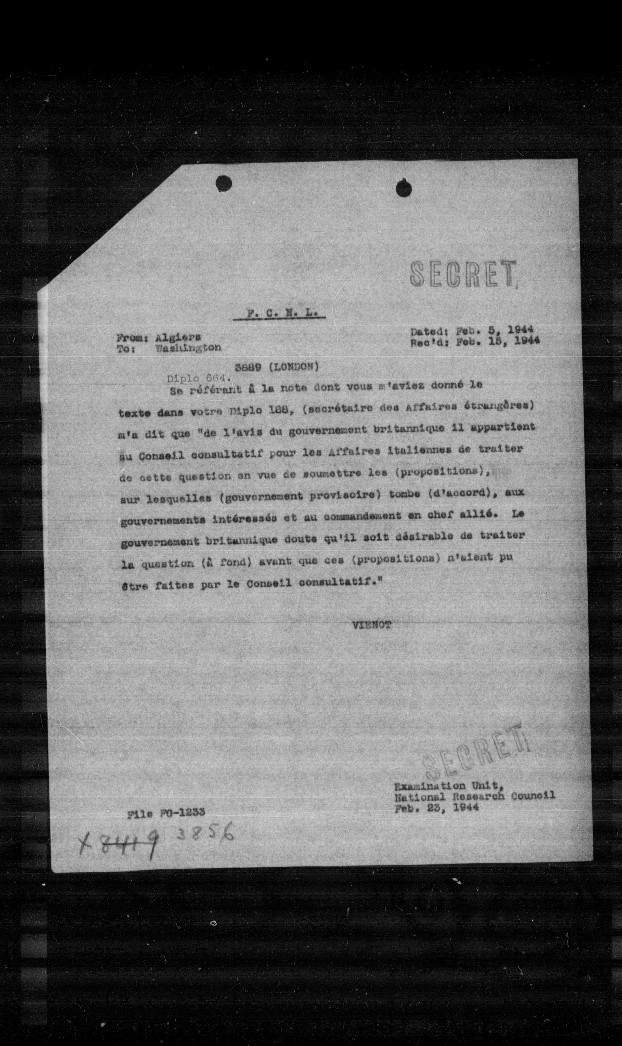 texte dans votre mipio 168, (secrétaire des Affaires étrangères) m'a dit que "de l'avis du gouvernement britannique il appartient au Conseil consultatif pour les Affaires italiennes de traiter de cette question en vue de soumettre les (propositions), sur lesquelles (gouvernement provisoire) tombe (d'accord), aux gouvernements intéressés et au commandement en chef allié. Le gouvernement britannique doute qu'il soit désirable de traiter la question (à fond) avant que ces (propositions) n'alent pu être faites par le Conseil consultatif."