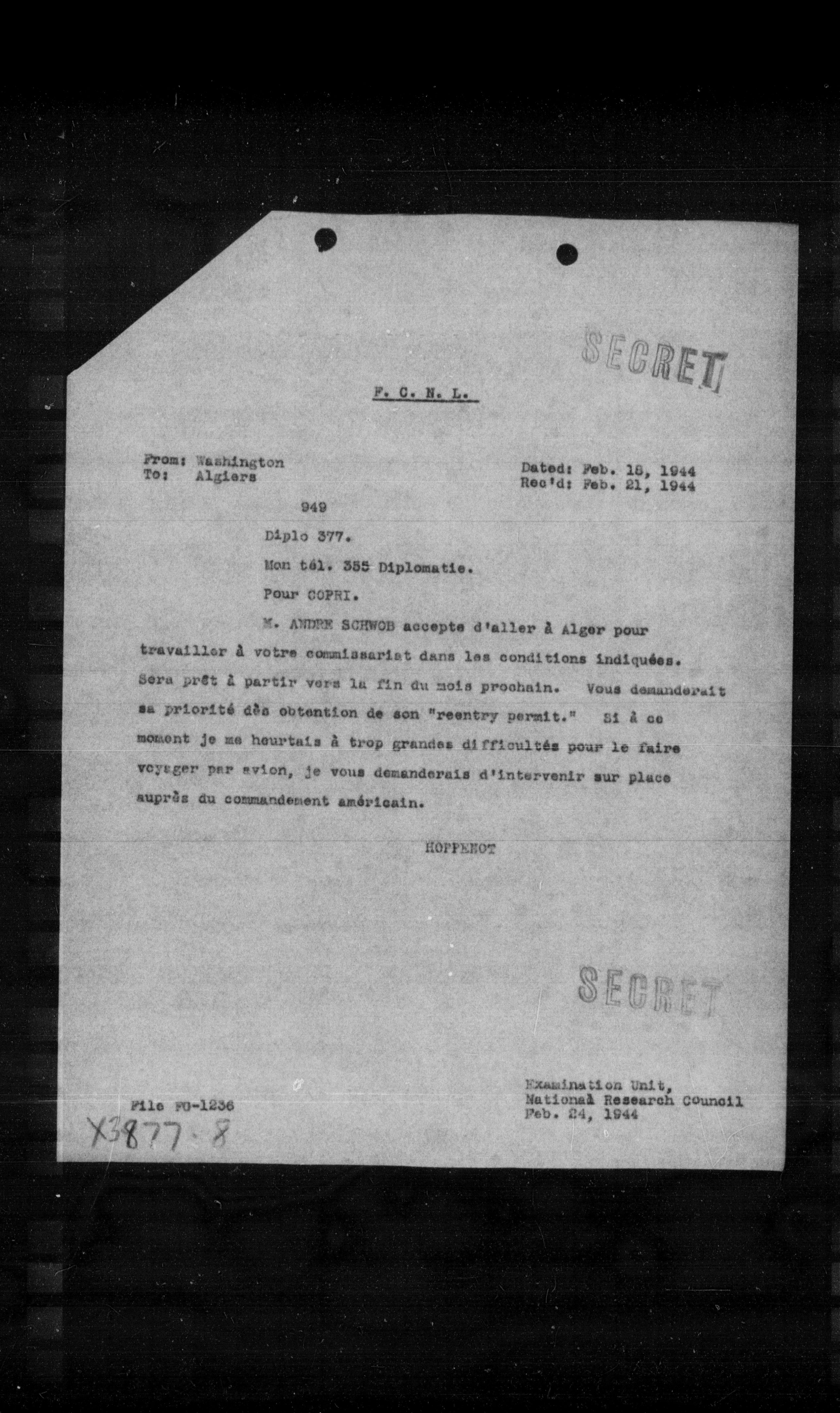 M. ANDRE SCHWGB accepte d'aller a Alger pour travailler a votre commissariat dans les conditions indiquées. Sera prêt a partir vers la fin du mois prochain. Vous demanderait sa priorite dés obtention de son "reentry permit." Si a ce moment je me heurtais a trop grandes difficultés pour le faire voyager par evion, je vous demanderais d'intervenir sur place auprès du commandement américain.