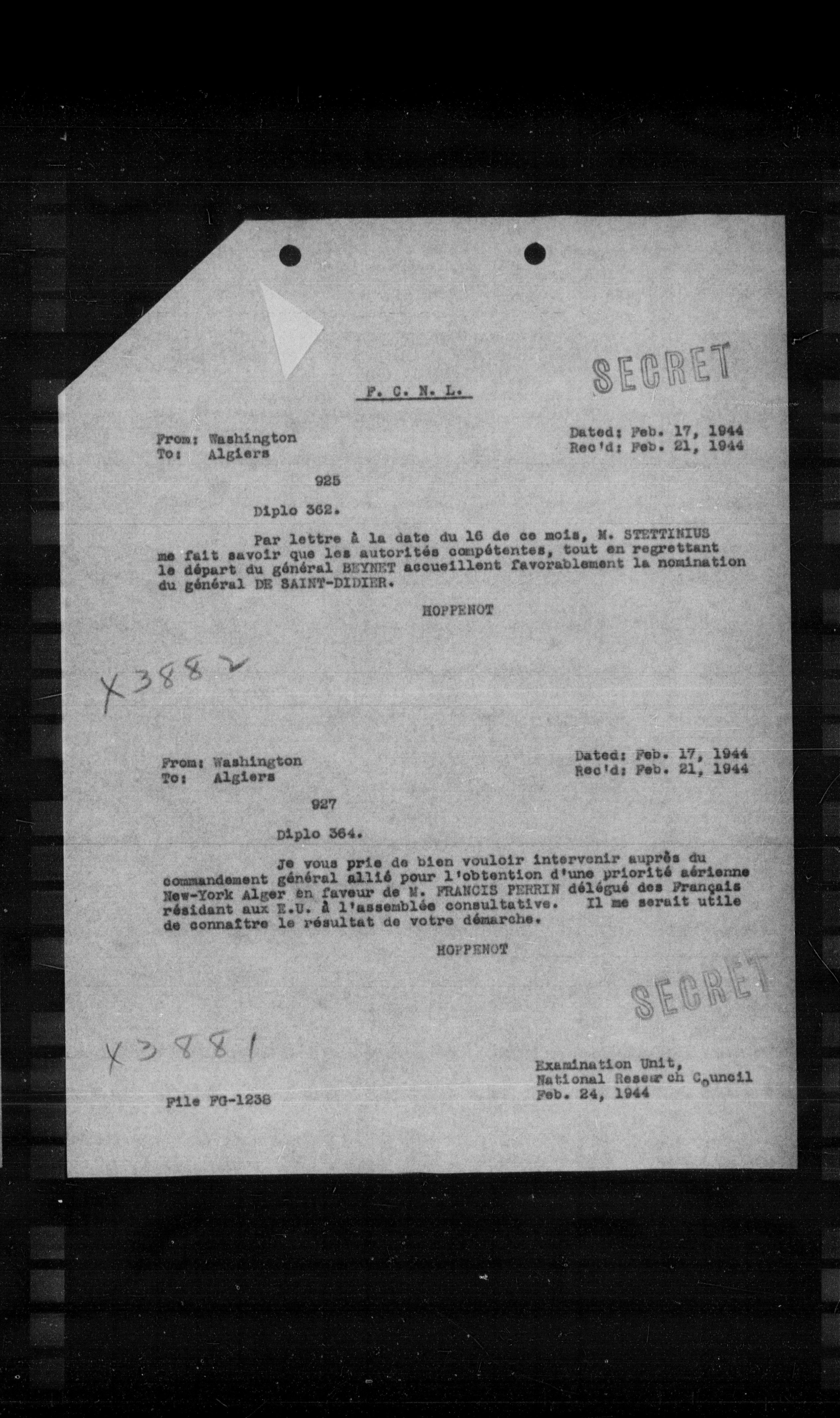 Je vous prie de bien vouloir intervenir auprès du commandement général allié pour l'obtention d'une priorité aérienne New-York Alger en faveur de M. FRANCIS PERRIN délégué des Français résidant aux R.O. à l'assemblée consultative. Il me serait utile de connaître le résultat de votre démarche.