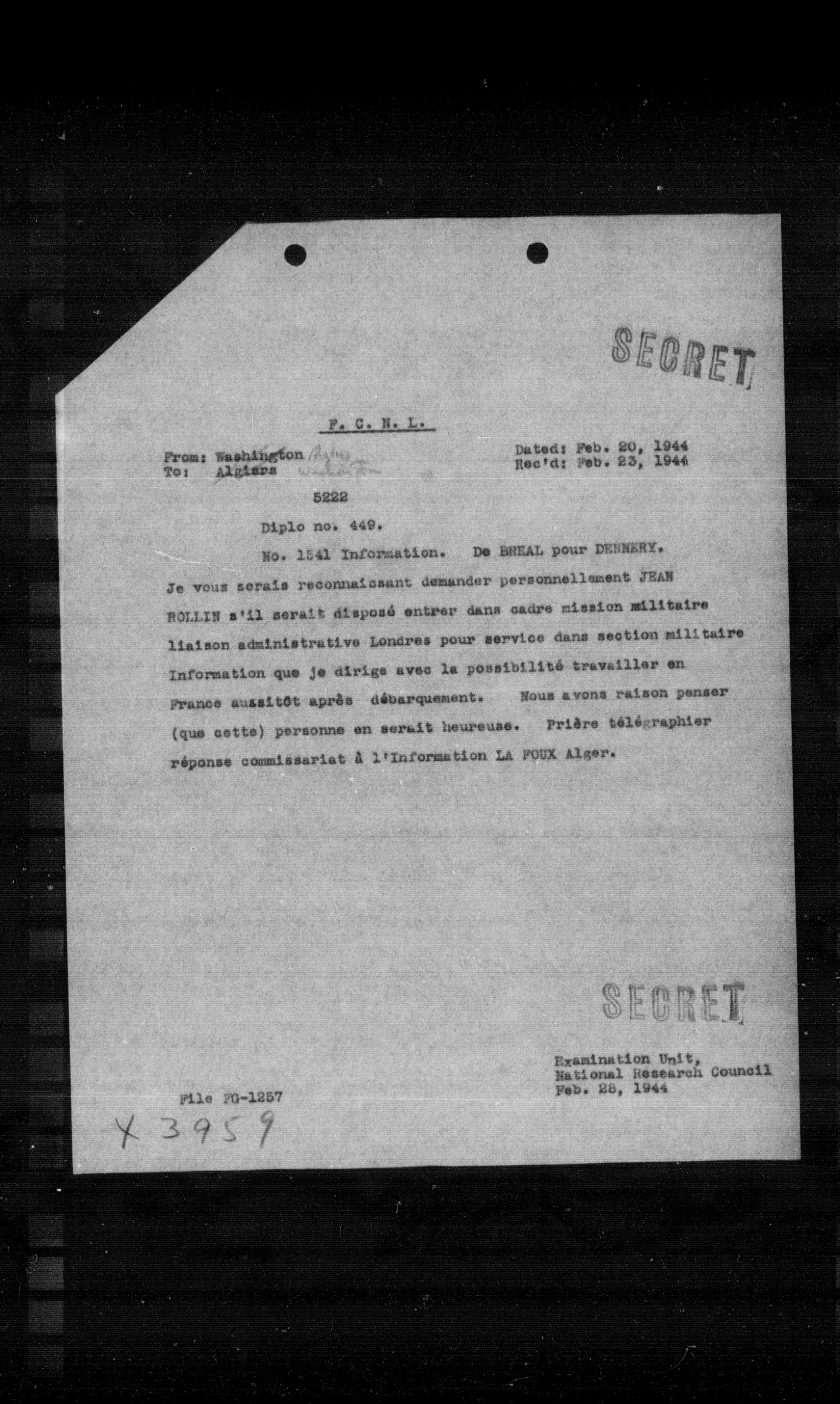 BOLLIN s'il serait disposé entrer dans cadre mission militaire liaison administrative Londres pour service dans section militaire Information que je dirige avec la possibilité travailler en France aussitôt après débarquement. Nous avons raison penser (que cette) personne en serait heureuse. Prí̂re télécraphier réponse commissariat à l'Information La POUX Alger.