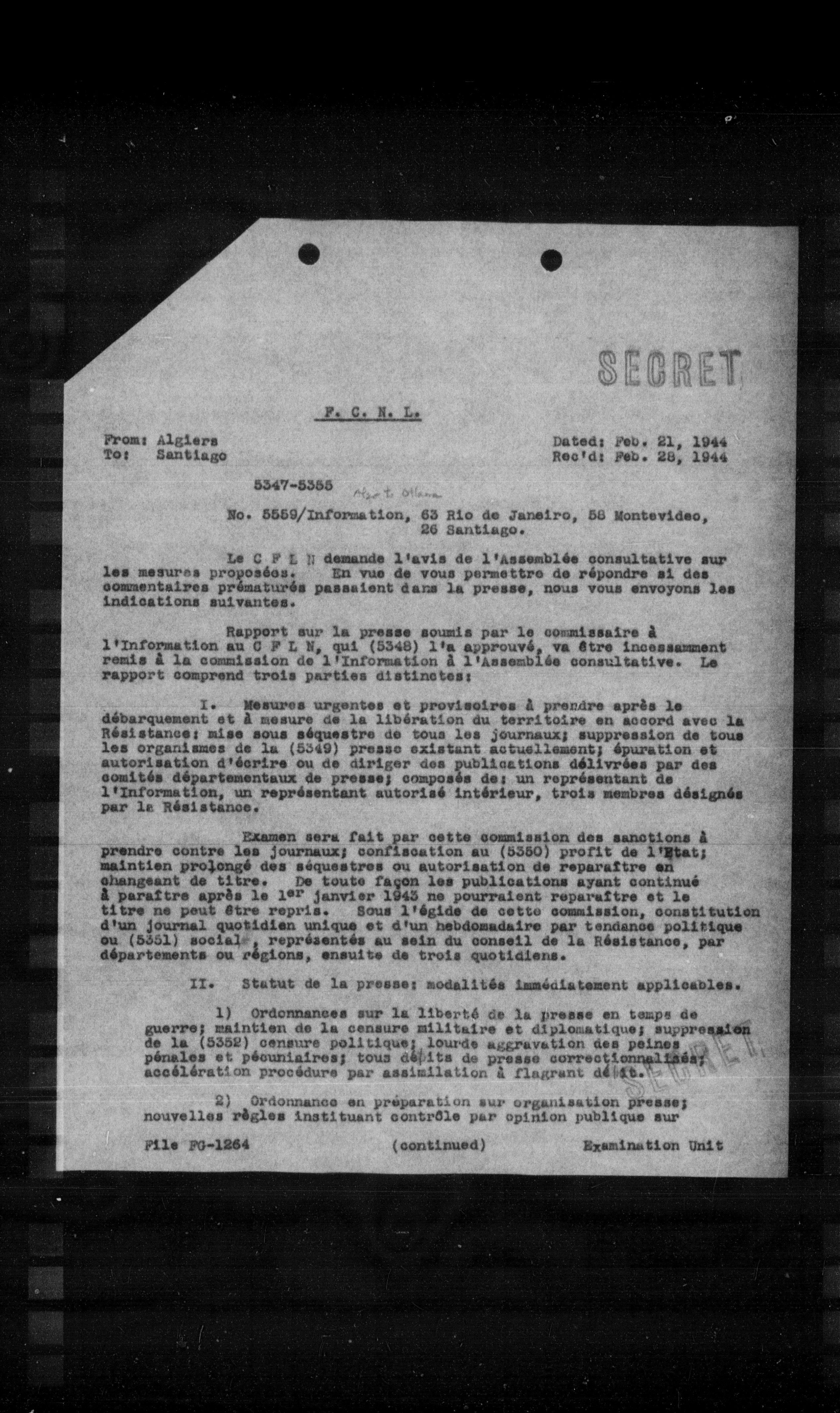 2) **Ordonnance en préparation sur organisation presse; nouvelles règles instituant contrôle par opinion publique sur File PG-1264 (continued)**