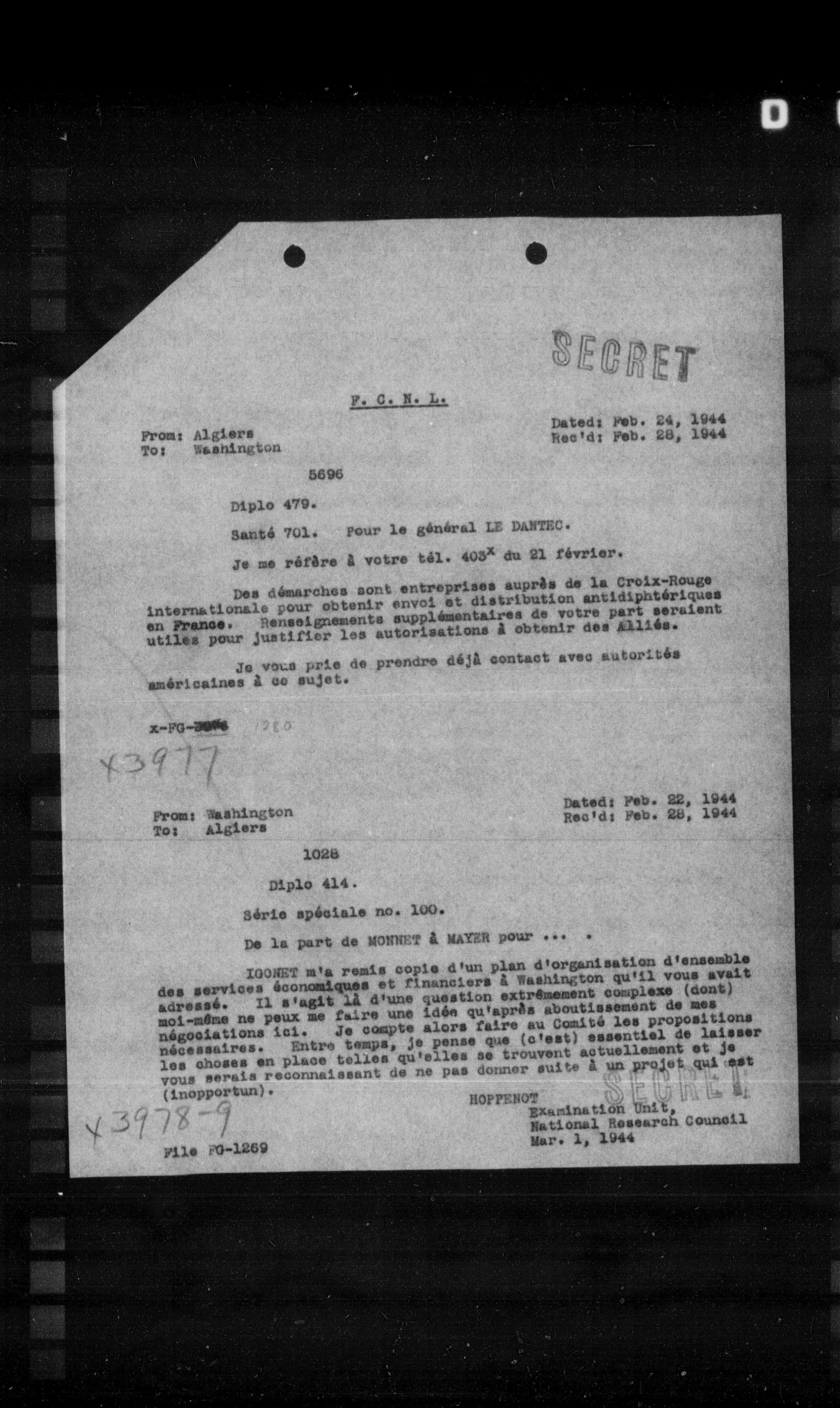 De la part de MONNET à MAYER pour . . .