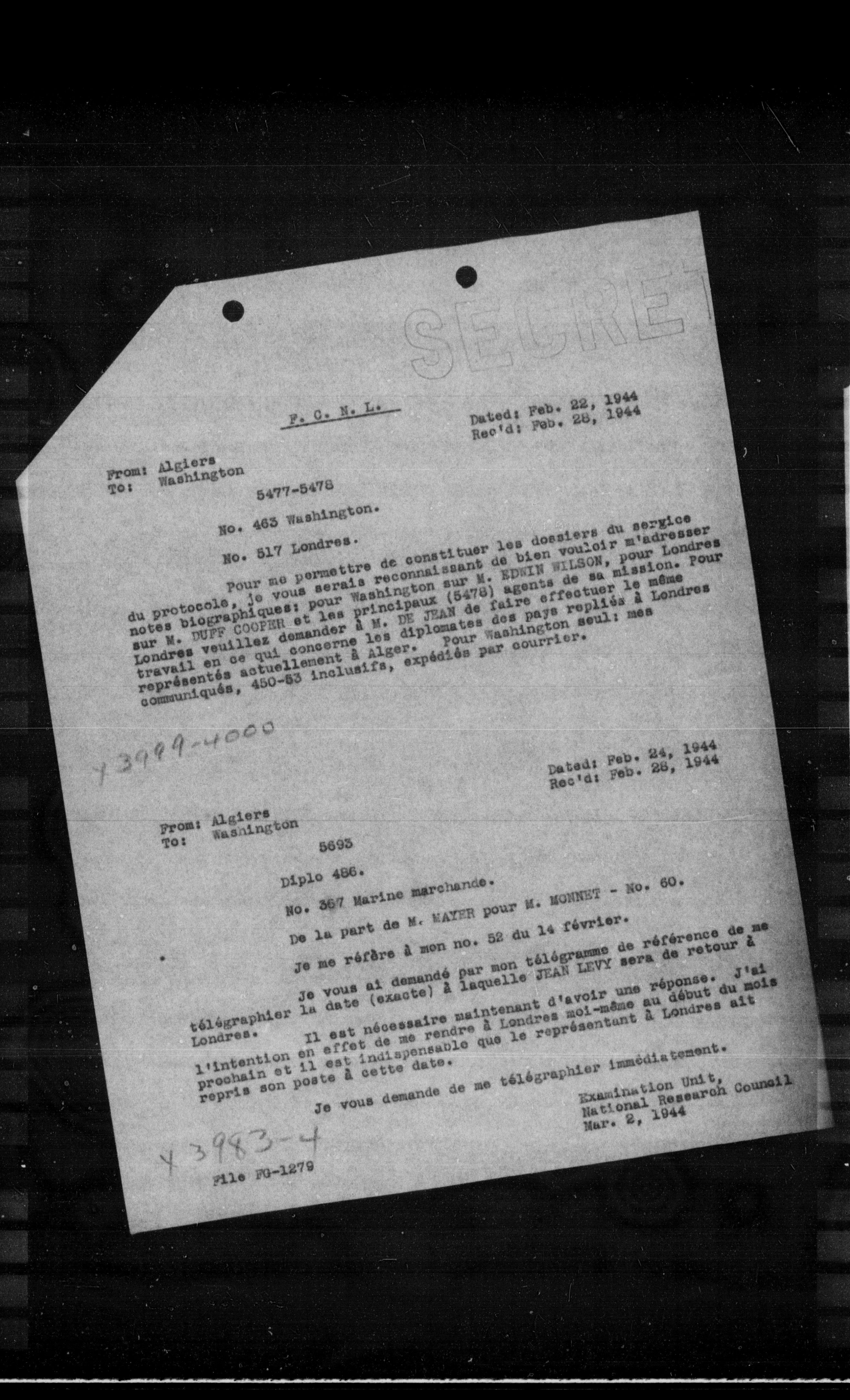 Londres, 10000 demander à M. DE JEAN de faire effectuer le même travail en ce qui concerne les diplomates des pays repliés à Londres représentés actuellement à Alger. Pour Washington seul: mes
