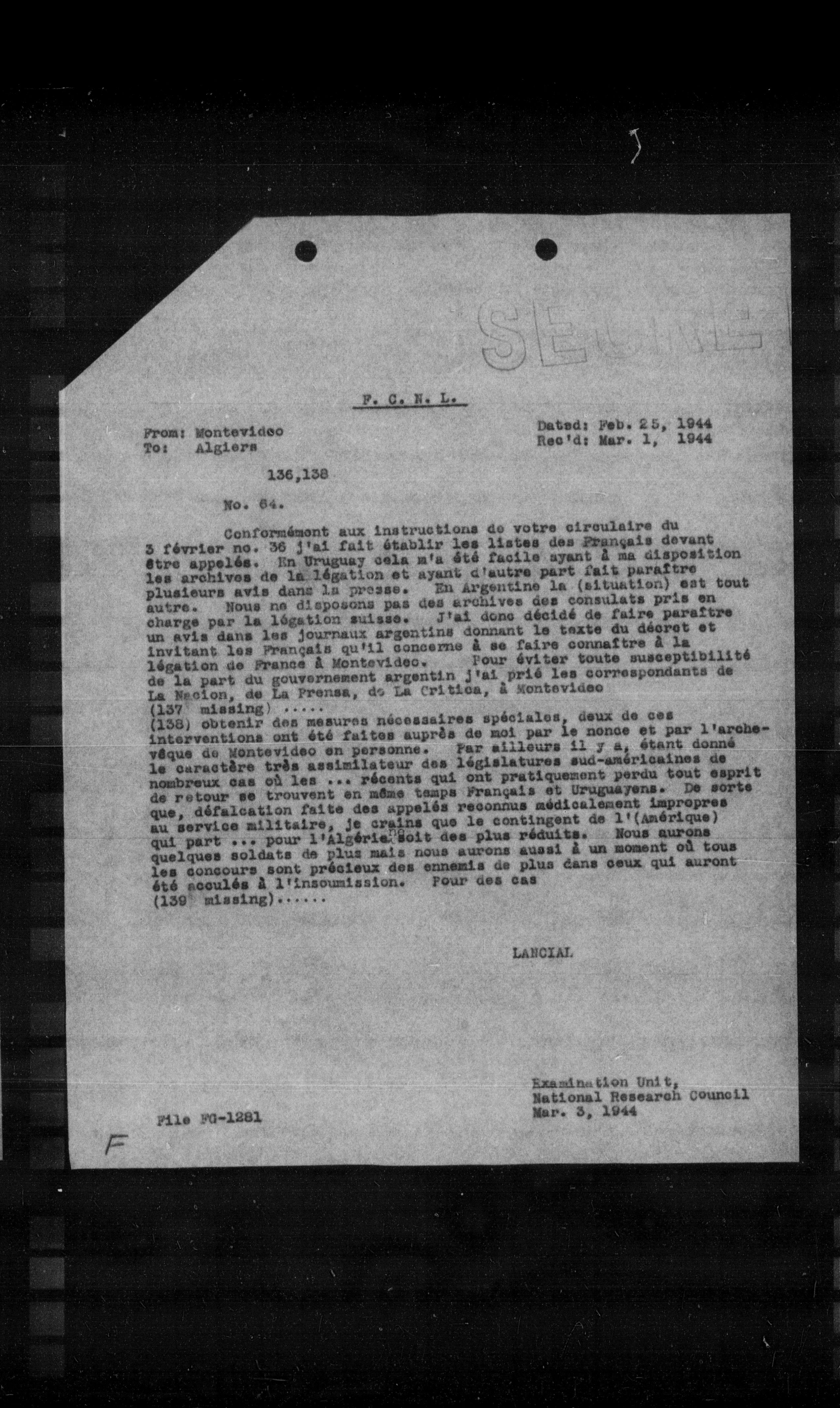 Conformément aux instructions do votre circulaire du 3 février no. 36 j'ai fait établir les listes des Français devant etre appelés. En Uruguay cela m'a été facile ayant a ma disposition les archives de la légation et ayant d'autre part fait paraitre plusieurs avis dans la presse. En Argentine la (situation) est tout autre. Nous ne disposons pas des archives des consulats pris en charge par la légation suisse. J'ai donc décidé de faire paraitre un avis dans les journaux argentins donnant le texte du décret et invitant les Frangals qu'il concerne a se faire connaître a la légation de France a Montevideo. Pour éviter toute susceptibilite de la part du gouvernement argentin j'ai pri6 les correspondants de La Nacion, de La Prensa, do La Critica, a Montevideo