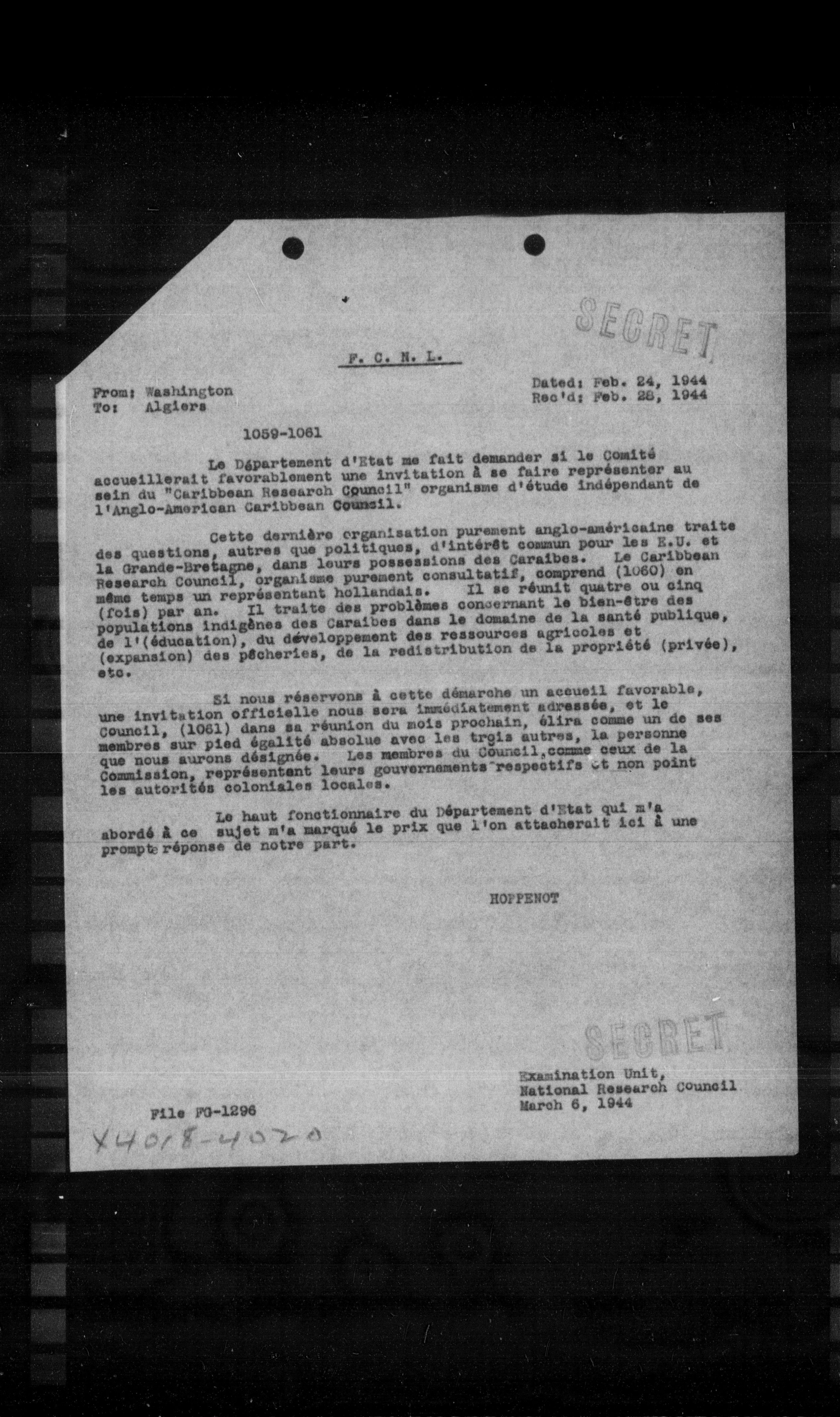 Le Dapartement d'Etat me fait demander si le Comité accueillerait favorablement une invitation a se faire représenter au sein du "Caribbean Research Council" organisme d'étude indépendant de l'Anglo-American Caribbean Council.