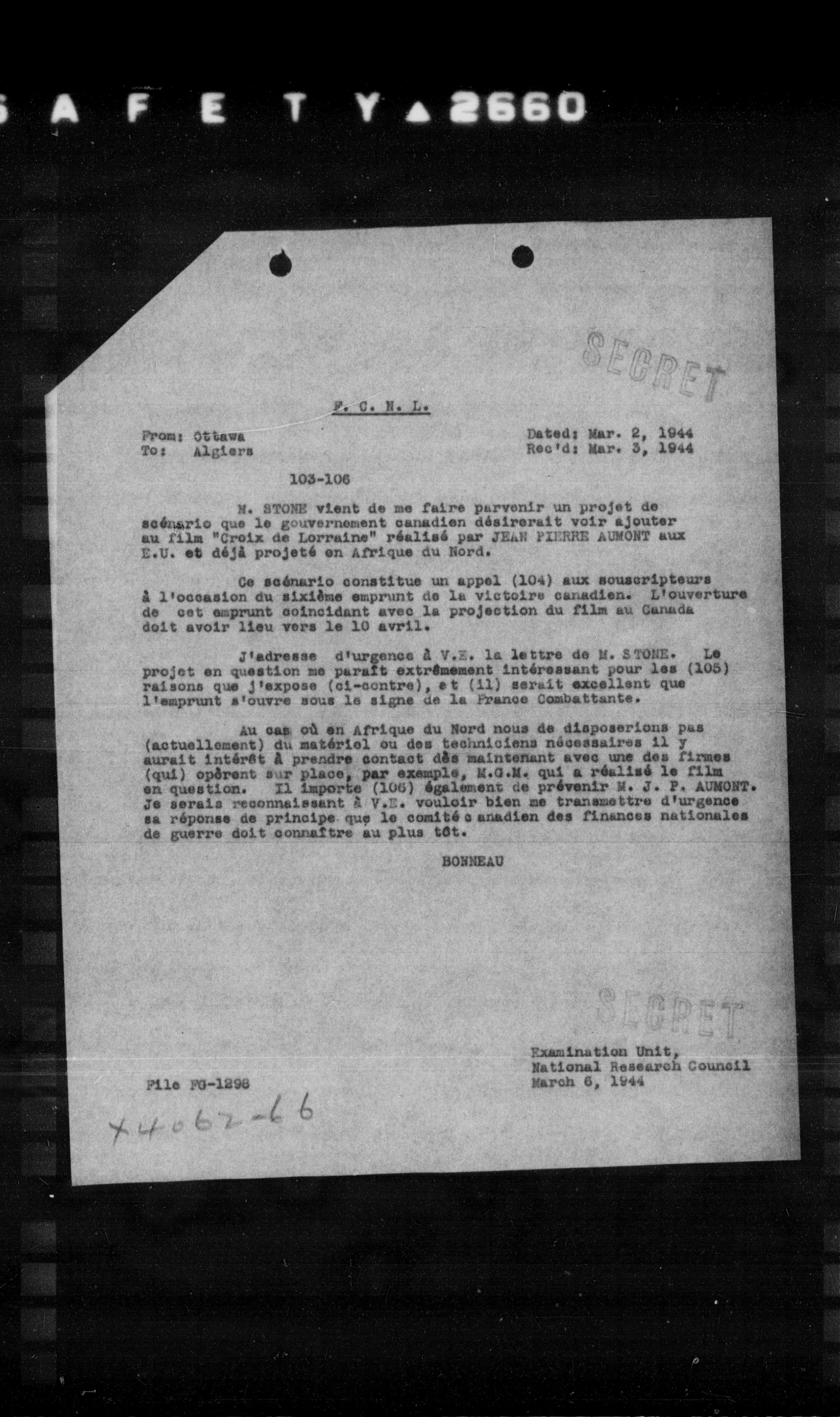 M. STONE vient de me faire parvenir un projet de scénario que le gouvernement canadien désirerait voir ajouter au film "Croix de Lorraine" réalisé par JEAN PIERRE AUMONT aux E.U. et déjà projeté en Afrique du Nord.