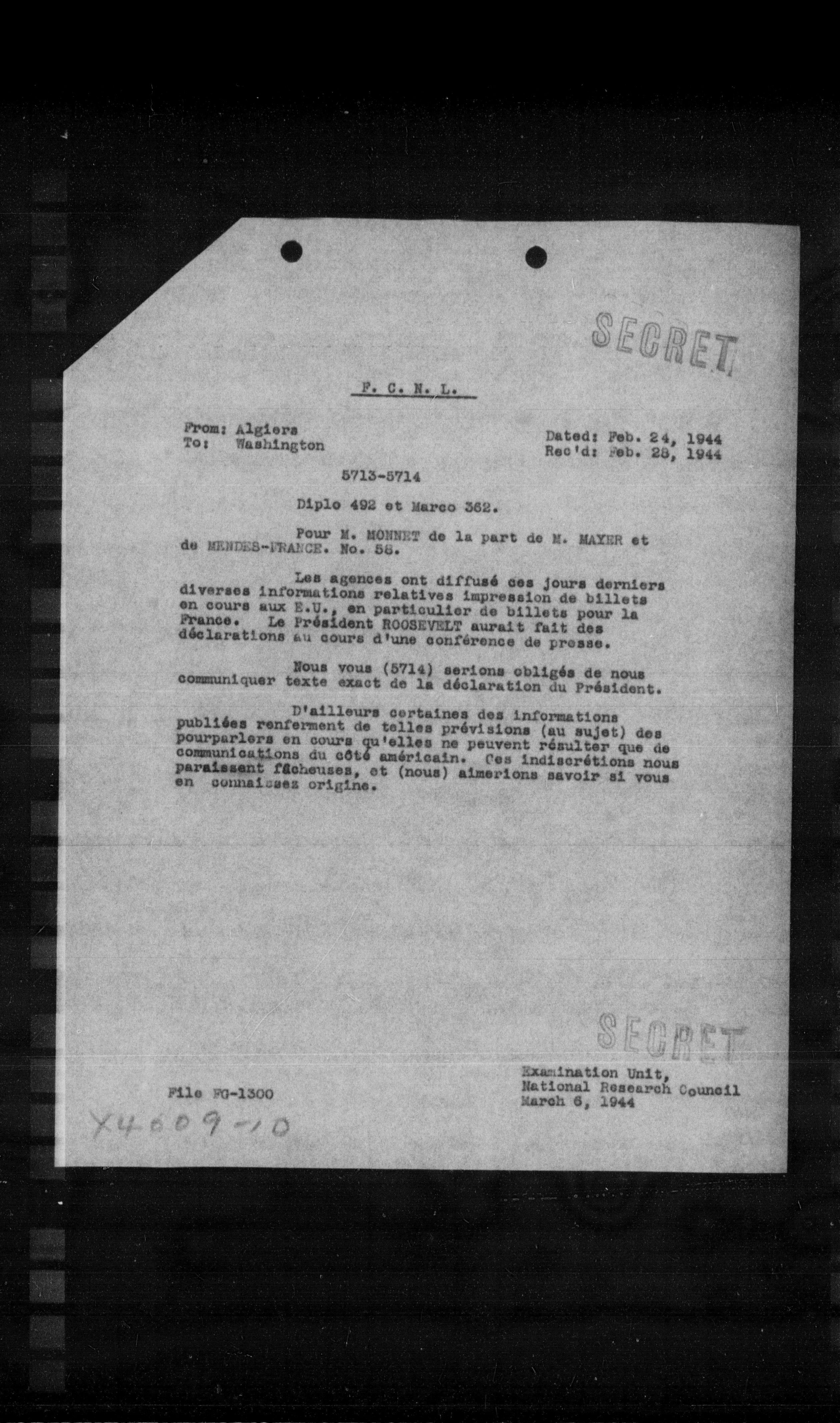 Les agences ont diffusé ces jours derniers diverses informations relatives impression de billets en cours aux E.U., en particulier de billets pour la Prence. Le Président ROOSEVELT aurait fait des déclarations au cours d'une conférence de presse.