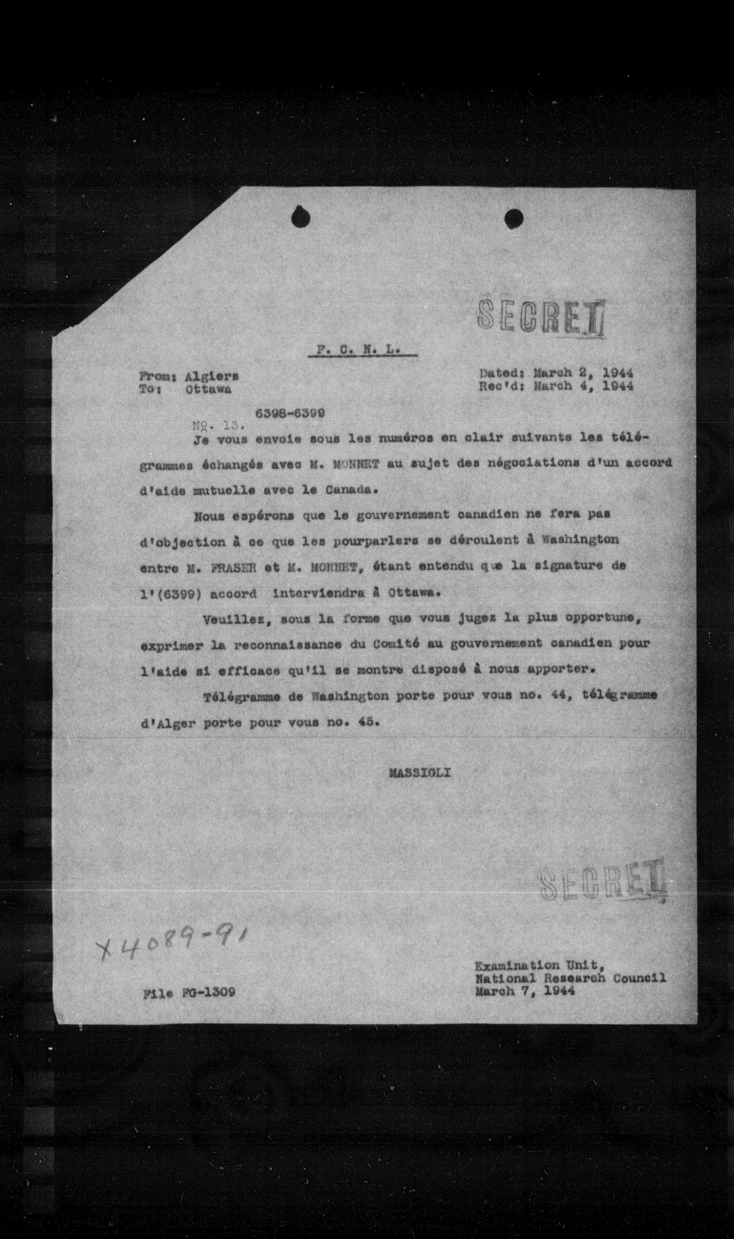 Tólégramme de Washington porte pour vous no. 44, tólégramme d'Alger porte pour vous no. 45.
