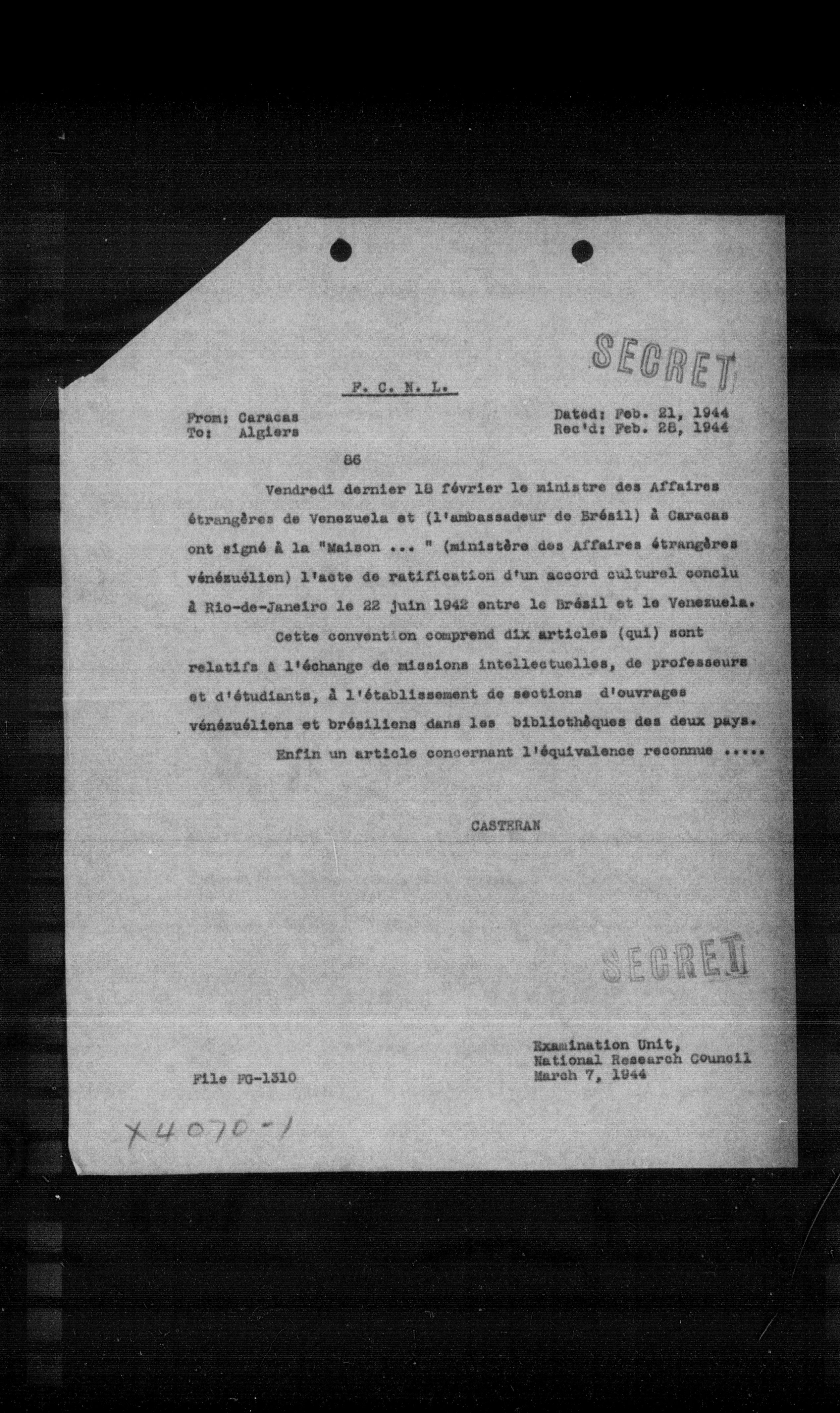 Vendredi dernier 18 février le ministre des Affaires étrangères de Venezuela et (1'ambassadeur de Brésil) a Caracas ont signé a la "Maison ..." (ministère des Affaires étrangères vénézuélien) l'acte de ratification d'un accord culturel conclu a Rio-de-Janeiro le 22 juin 1942 entre le brésil et le Venezuela. Cette convent: on comprend dix articles (qui) sont relatifs a l'échange de missions intellectuelles, de professeurs et d'étudiants, a l'établissement de sections d'ouvrages vénézuéliens et brésiliens dans les bibliothèques des deux pays. Enfin un article concernant l'équivalence reconnue