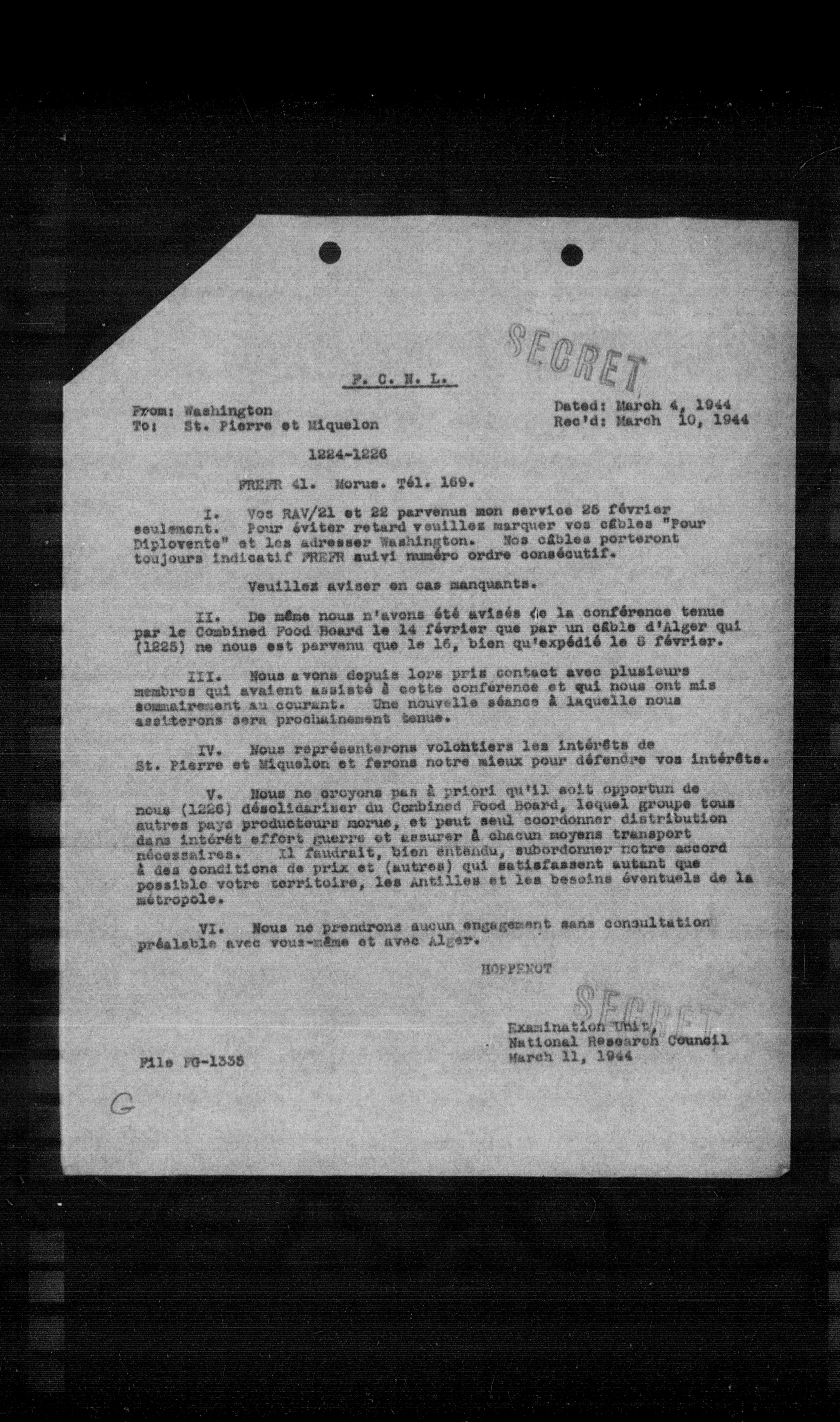 II. De même nous n'avons été avisés de la conférence tenue par le Combined Food Board le 14 février que par un câble d'Alger qui (1225) ne nous est parvenu que le 16, bien qu'expédié le 5 février.