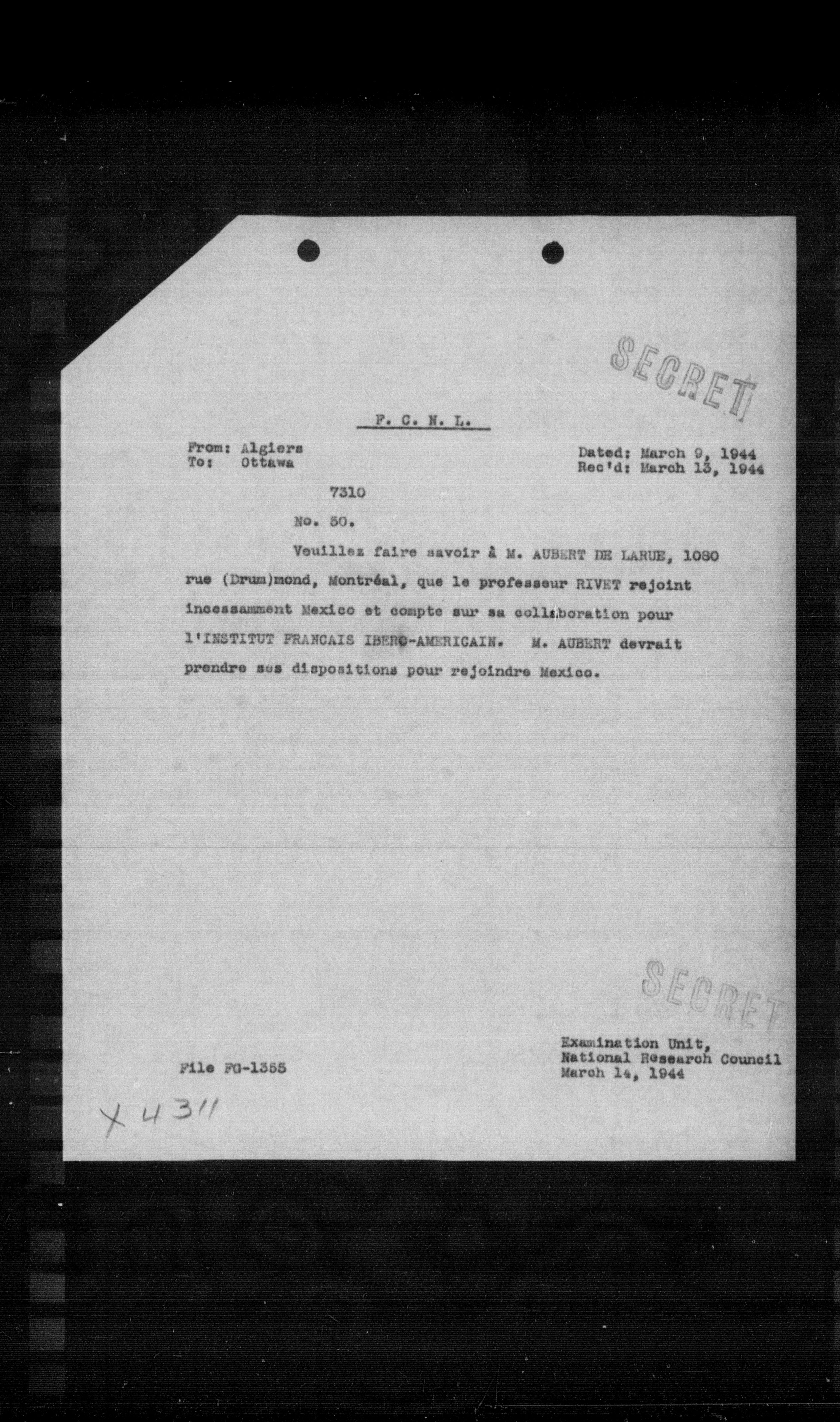 Veuillez faire savoir à M. AUBERT DE LARUE, 1030 rue (Drum)mond, Montréal, que le professeur RIVET rejoint incessamment Mexico et compte sur sa collaboration pour l'INSTITUT FRANCAIS IBERO-AMERICAIN. M. AUBERT devrait prendre ses dispositions pour rejoindre Mexico.