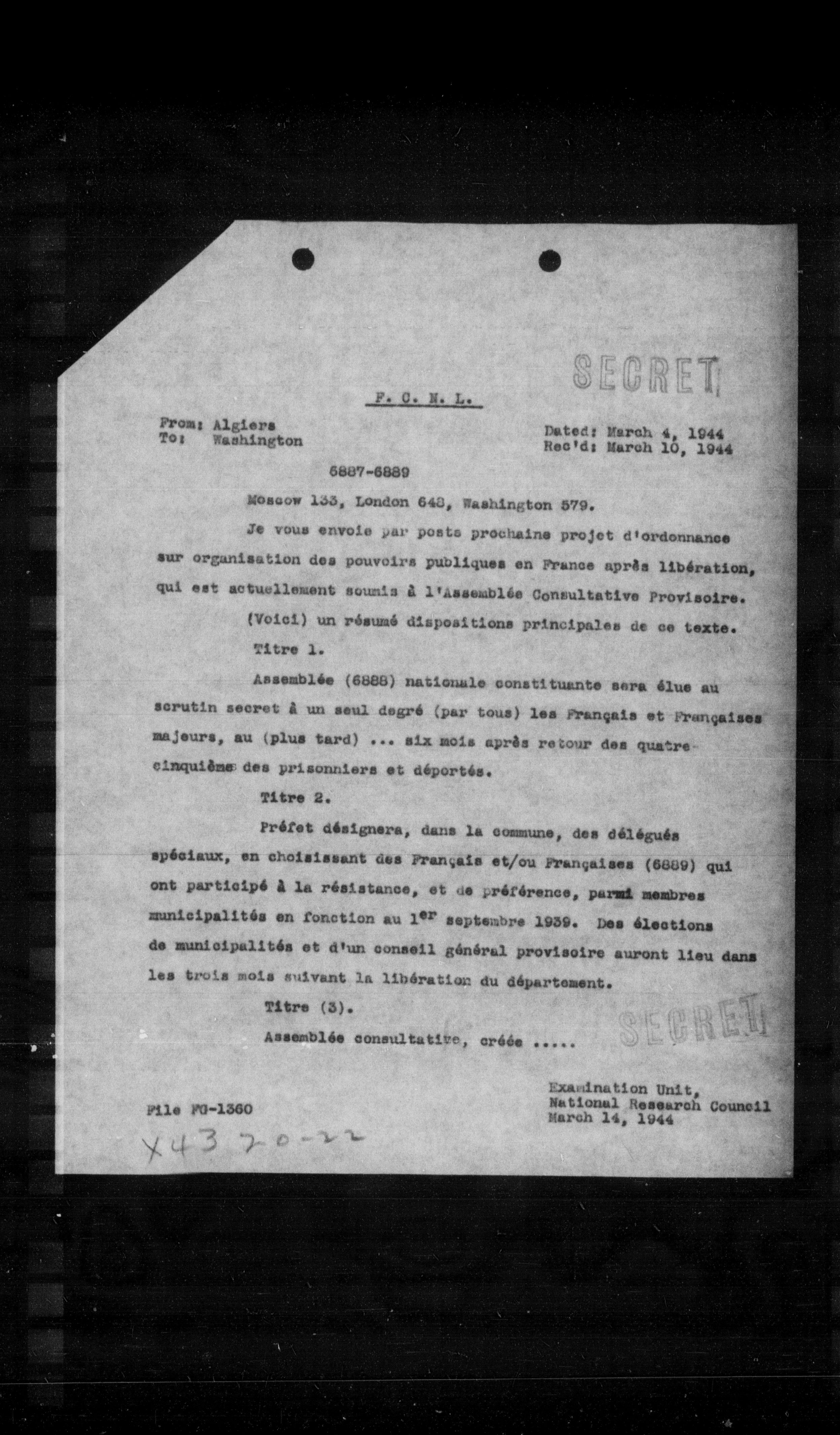 Je vous envoie par poste prochaine projet d'ordonnance sur organisation des pouvoirs publiques en France après libération, qui est actuellement soumis à l'Assemblée Consultative Provisoire.