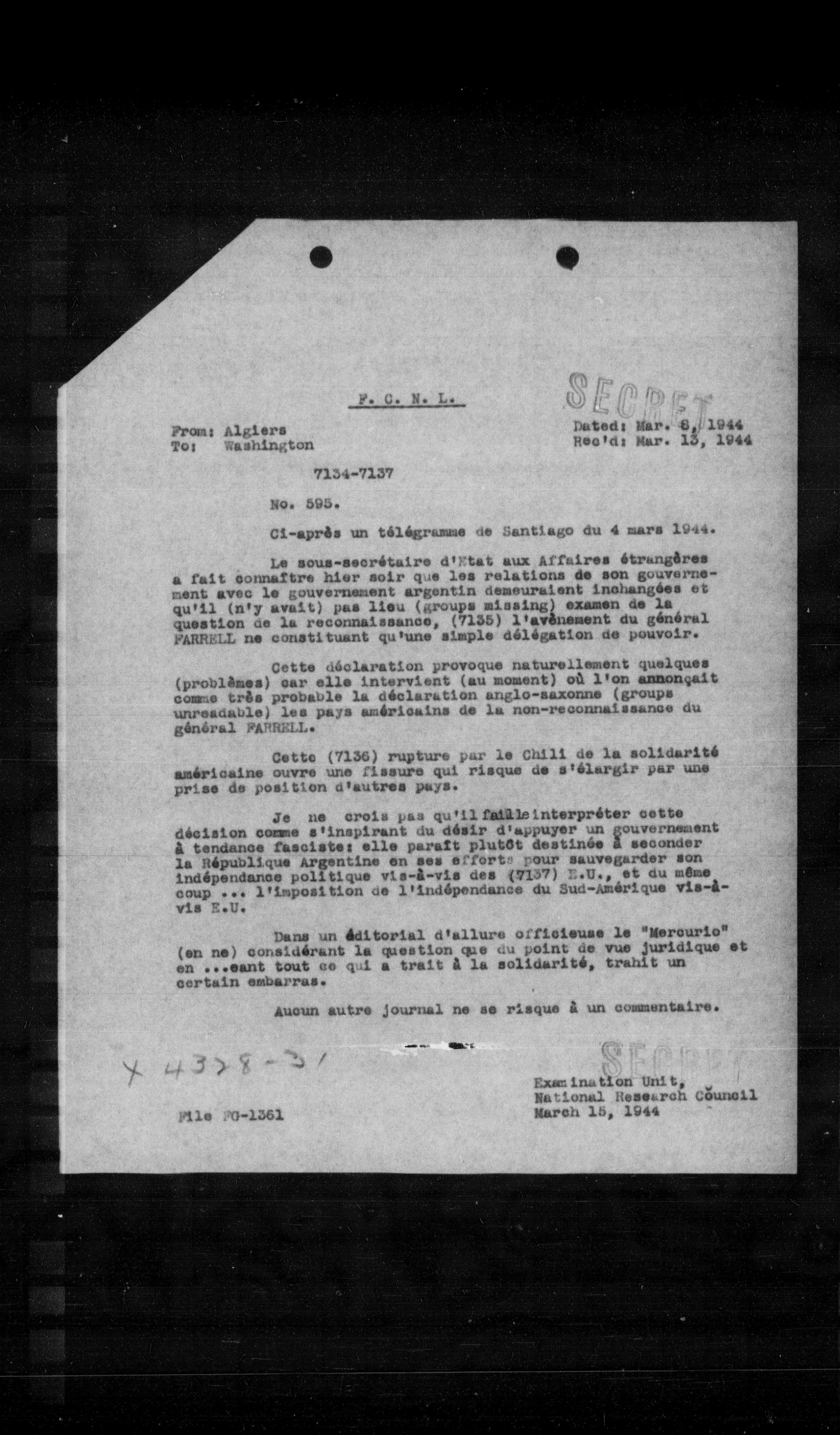 Cette déclaration provoque naturellement quelques (problèmes) car elle intervient (au moment) où l'on annonçait comme très probable la déclaration anglo-saxonne (groupe unreadable) les pays américains de la non-reconnaissance du général FARRELL.