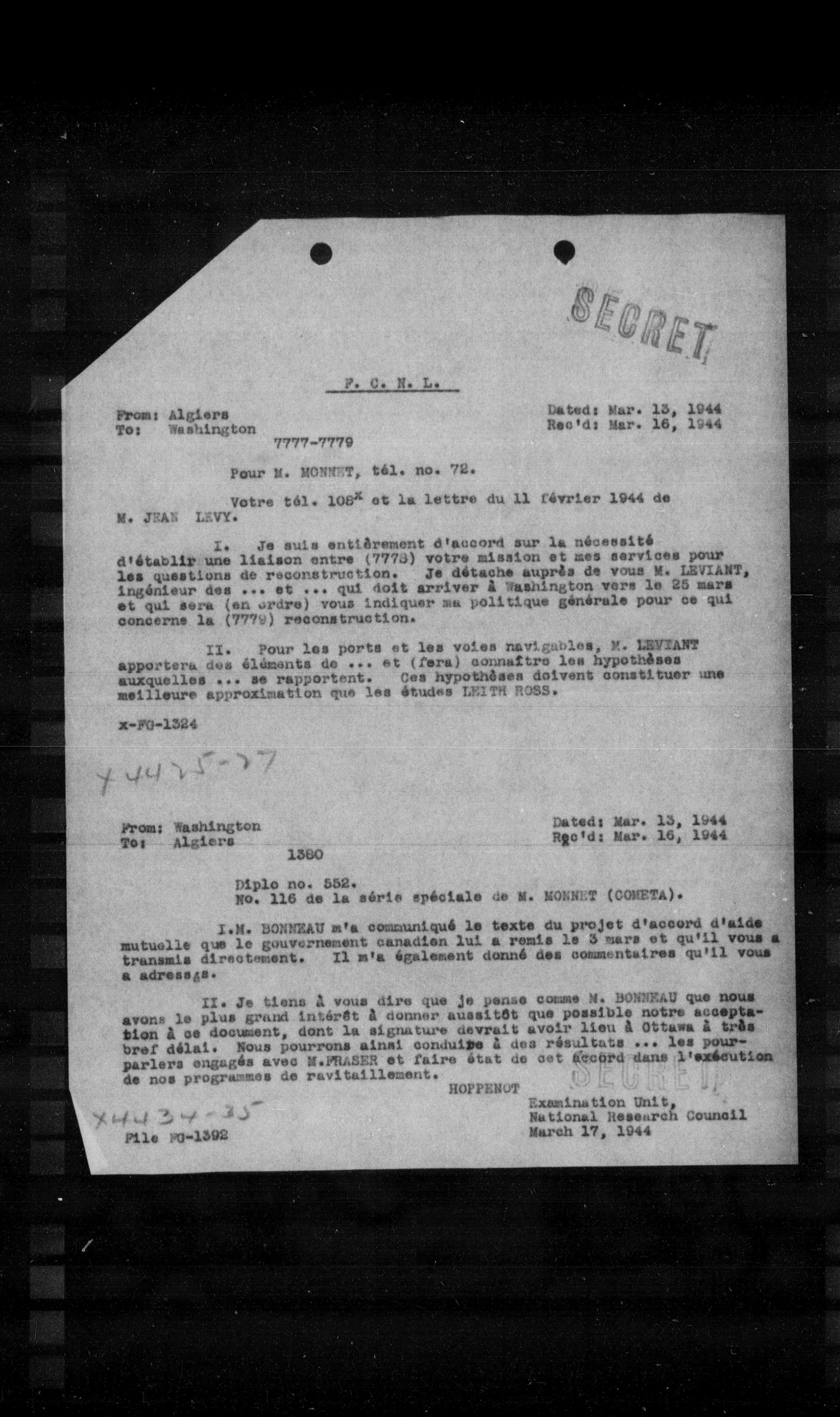 I. Je suis entièrement d'accord sur la nécessité d'établir une liaison entre (7773) votre mission et mes services pour les questions de reconstruction. Je déteche auprès de vous M. LEVIANT, ingénieur des ... et ... qui doit arriver à Washington vers le 25 mars et qui sera (en ordre) vous indiquer ma politique générale pour ce qui concerne la (7779) reconstruction.