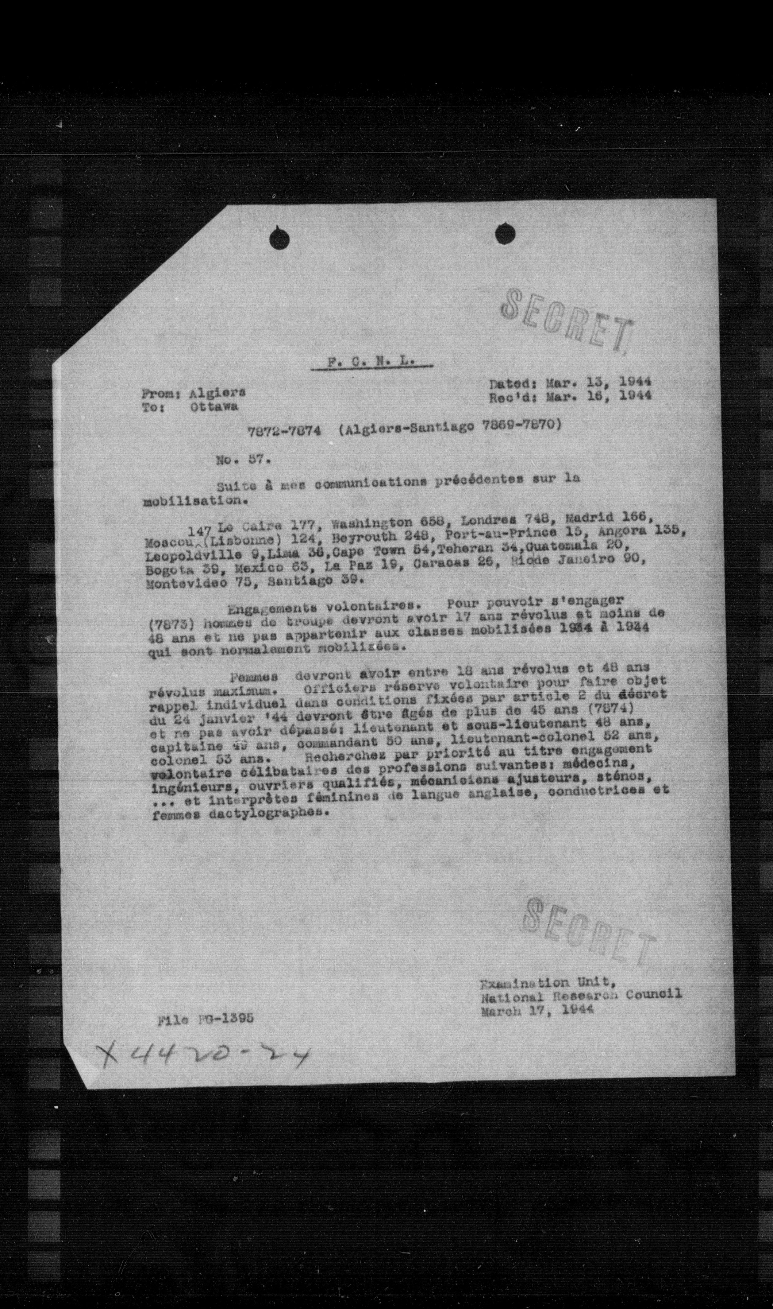 Pemmes devront avoir entre 18 ans révolus et 48 ans révolus maximum. Officiers réserve volontaire pour faire objet rappel individuel dans conditions fixées par article 2 du décret du 24 janvier '44 dovront etre âgés de plus de 45 ans (7874) et ne pas avoir dépassé: lieutenant et sous-lieutenant 48 ans, capitaine 49 ans, commandant 50 ans, lieutenant-colonel 52 ans, colonel 53 ans. Recherches par priorité au titre engagement volonteiro célibataires des professions suivantes: médecins, ingénieurs, ouvriers qualifiés, mécaniciens ajusteurs, aténos, ... et interprètes féminines de langue anglaise, conductrices et femmes dactylographes.