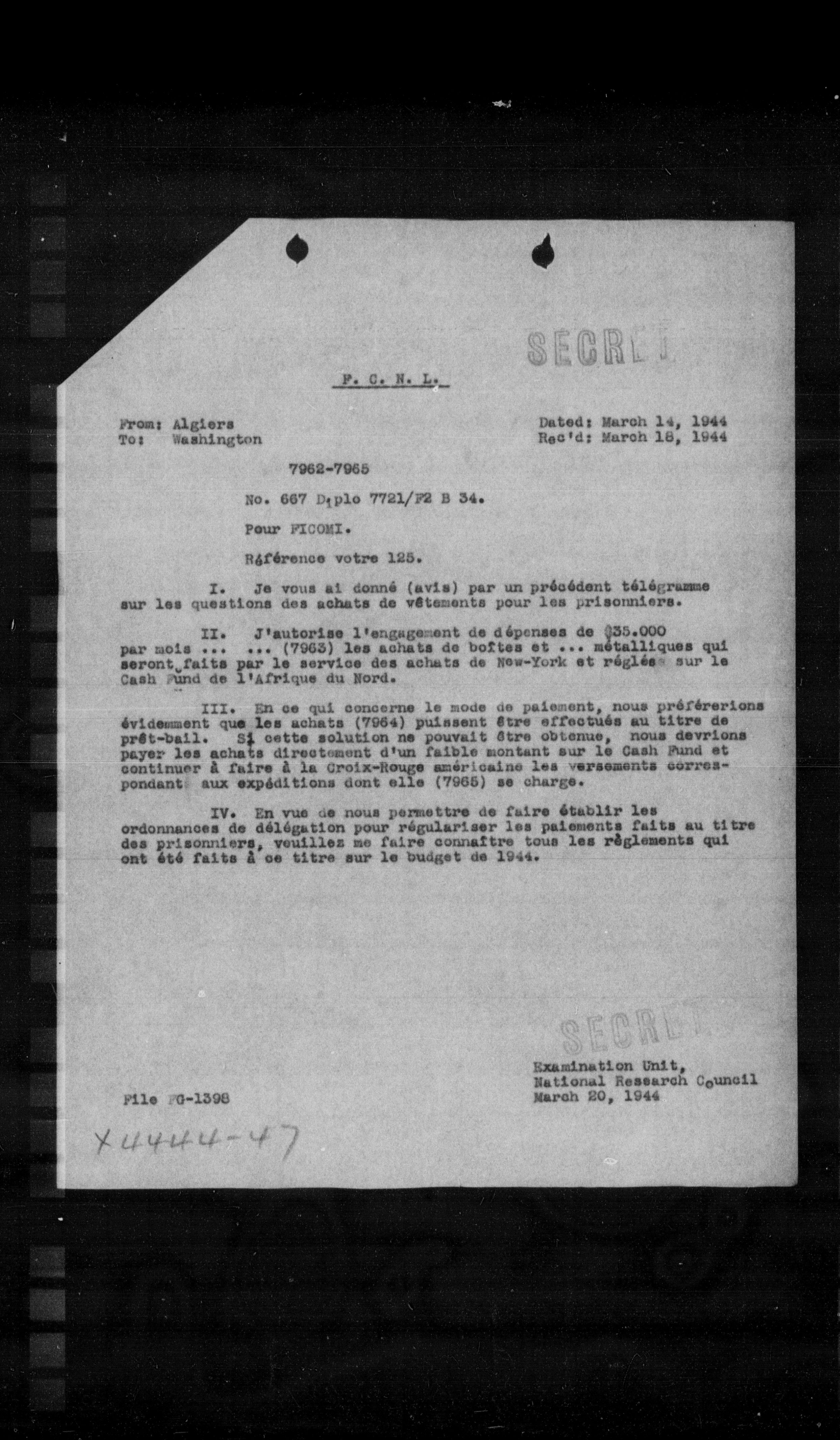 IV. En vue de nous permettre de faire établir les ordonnances de délégation pour régulariser les paiements faits au titre des prisonniers, veuillez me faire connaître tous les règlements qui ont été faits à ce titre sur le budget de 1944.
