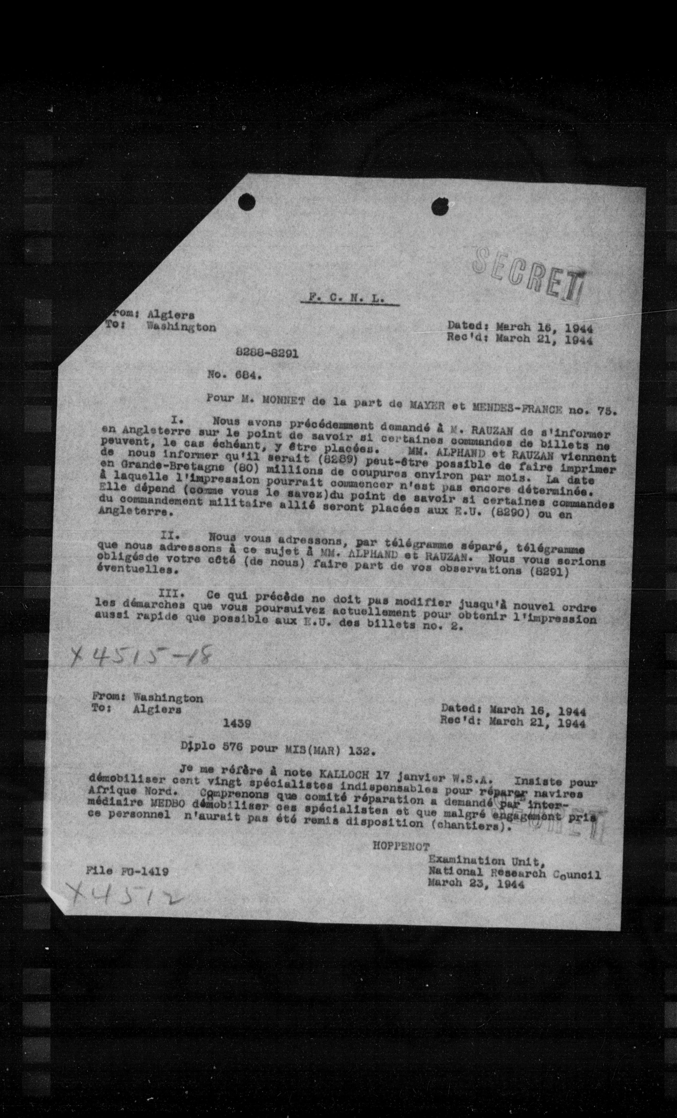 I. Nous avons précédemment demandé à M. RAUZAN de s'informer en Angleterre sur le point de savoir si certaines commandes de billets ne peuvent, le cas échéant, y être placées. MM. ALPHAND et RAUZAN viennent de nous informer qu'il serait (8289) peut-être possible de faire imprimer en Grande-Bretagne (80) millions de coupures environ par mois. La date à laquelle l'impression pourrait commencer n'est pas encore déterminée. Elle dépend (comme vous le savez) du point de savoir si certaines commandes du commandement militaire allié seront placées aux E.U. (8290) ou en Angleterre.
