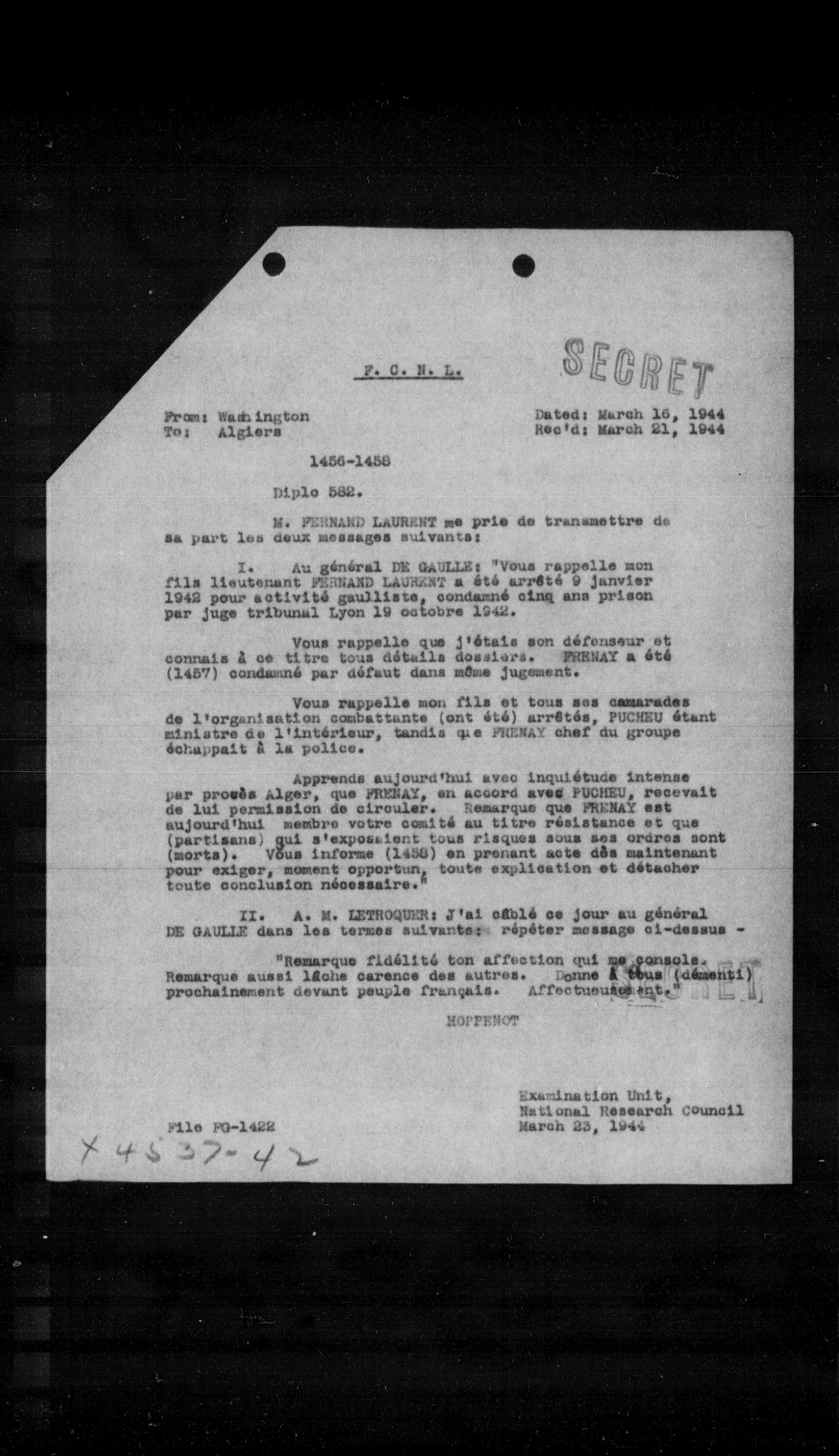 I. Au général DE GAULLE: "Vous rappelle mon fils lieutenant FERNAND LAURENT a été arrêté 9 janvier 1942 pour activité gaulliste, condamné cinq ans prison par juge tribunal Lyon 19 octobre 1942.