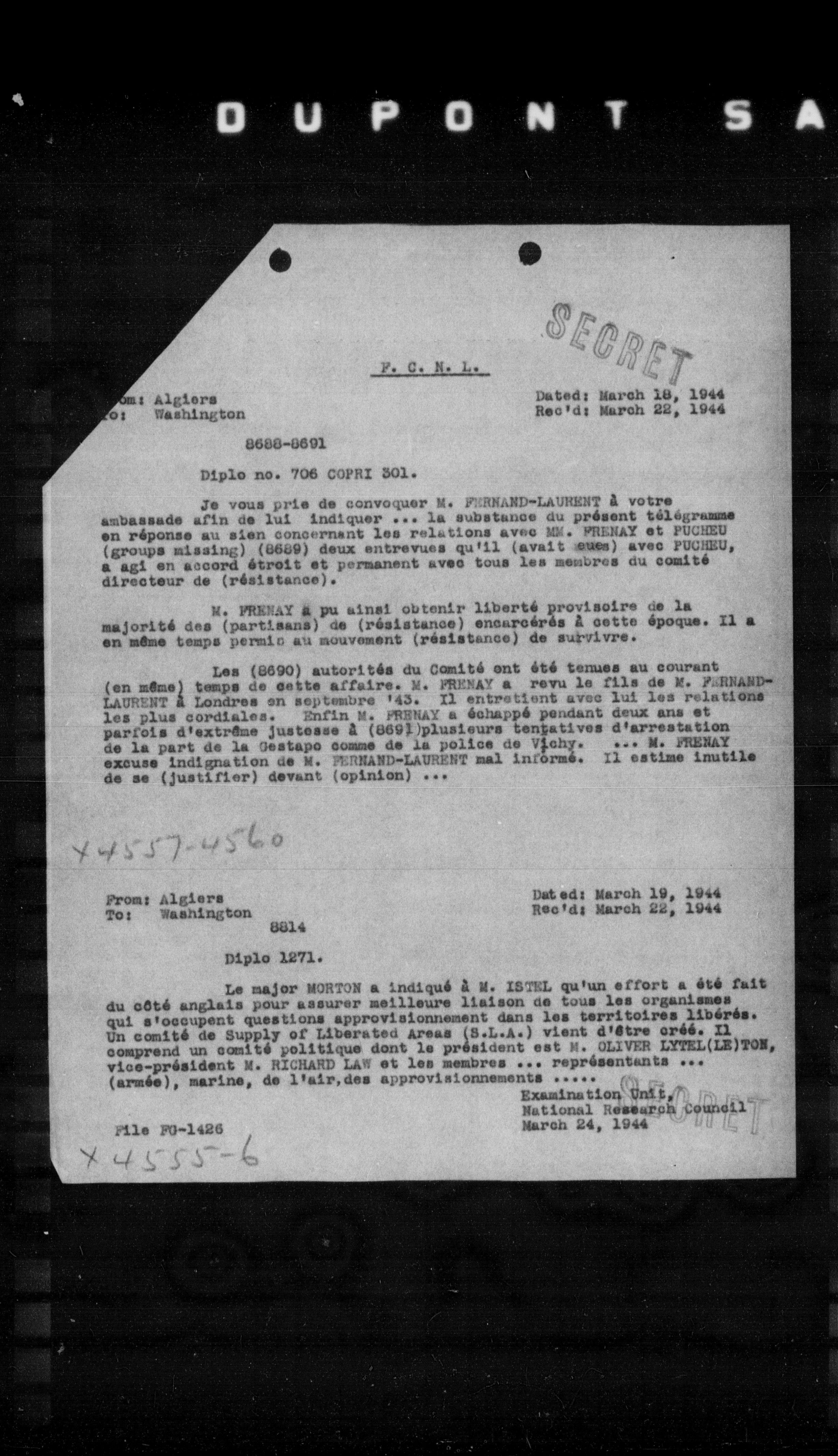 Les (8690) autorités du Comité ont été tenues au courant (en même) temps de cette affaire. **M. FRENAY** a revu le file de **M. FERNAND-LAURENT** à Londres en septembre '43. Il entretient avec lui les relations les plus cordiales. Enfin **M. FRENAY** a échappé pendant deux ans et parfois d'extrême justesse à (8691) plusieurs tentatives d'arrestation de la part de la Gestapo comme de la police de Vichy. **M. FRENAY** excuse indignation de **M. FERNAND-LAURENT** mal informé. Il estime inutile de se (justifier) devant (opinion) ...