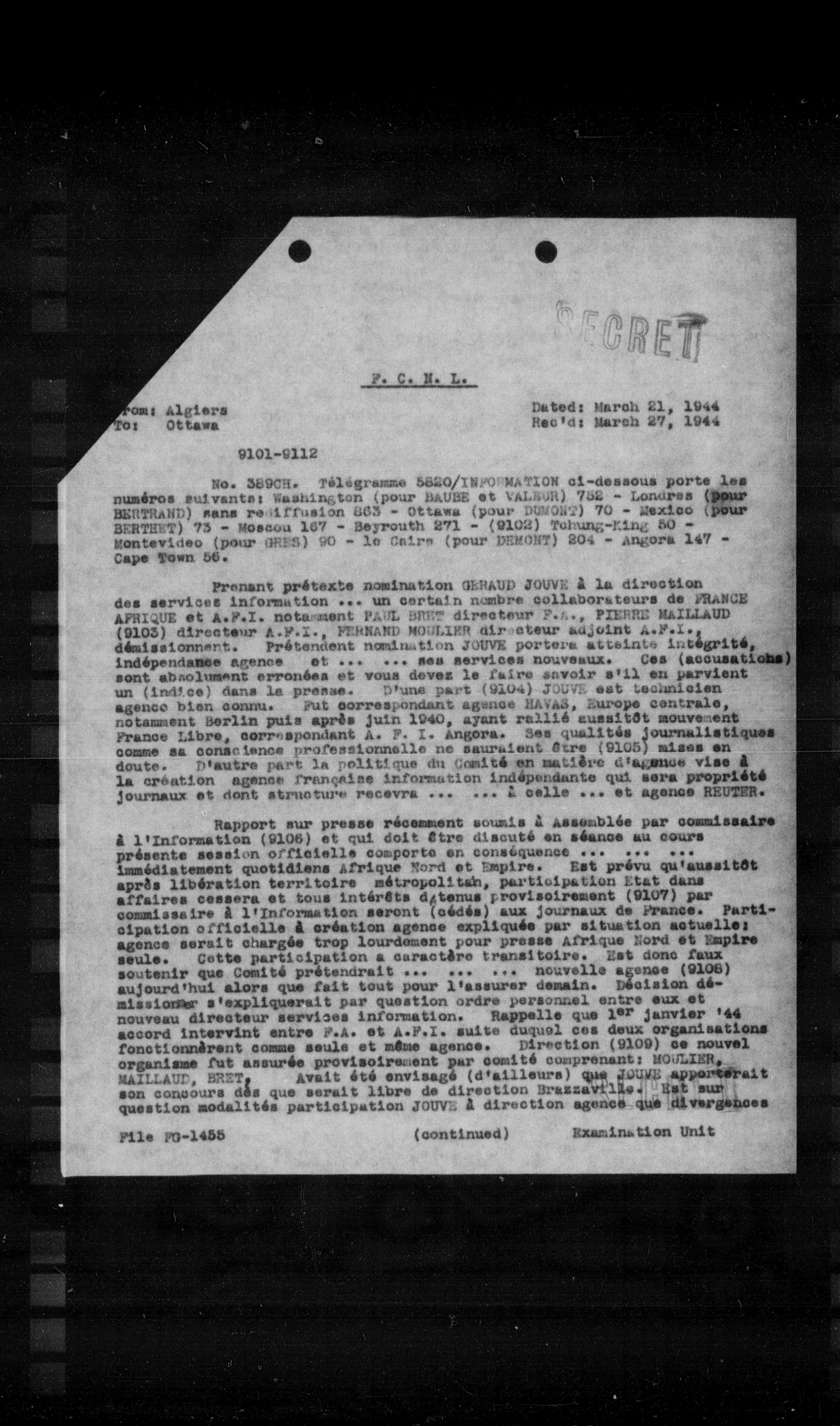 Prenant prétexte nomination GEBAUD JOUVE à la direction des services information ... un certain nombre collaborateurs de FRANCE AFRIQUE et A.F.I. notamment PAUL BRET directeur F.S., PIERRE MAILLAUD (9103) directeur A.F.I., FERNAND MOULIER directeur adjoint A.F.I., démissionnent. Prétendent nomination JOUVE porte atteinte intégrité indépendance agence et ... ses services nouveaux. Ces (accusations) sont absolument erronées et vous devez le faire savoir s'il en parvient un (indice) dans la presse. D'une part (9104) JOUVE est technicien agence bien connu. Par correspondant agence MAVAS, Europe centrale, notamment Berlin puis après juin 1940, ayant rallié aussitôt mouvement France Libre, correspondant A. P. I. Angers. Ces qualités journaliétiques, comme sa conscience professionnelle ne sauraient être (9105) mises en doute. D'autre part la politique du Comité en matière d'agence vise à la création agence française information indépendante qui sera propriété fournaise et dont structure recevra ... ... à celle ... et agence REUTER.