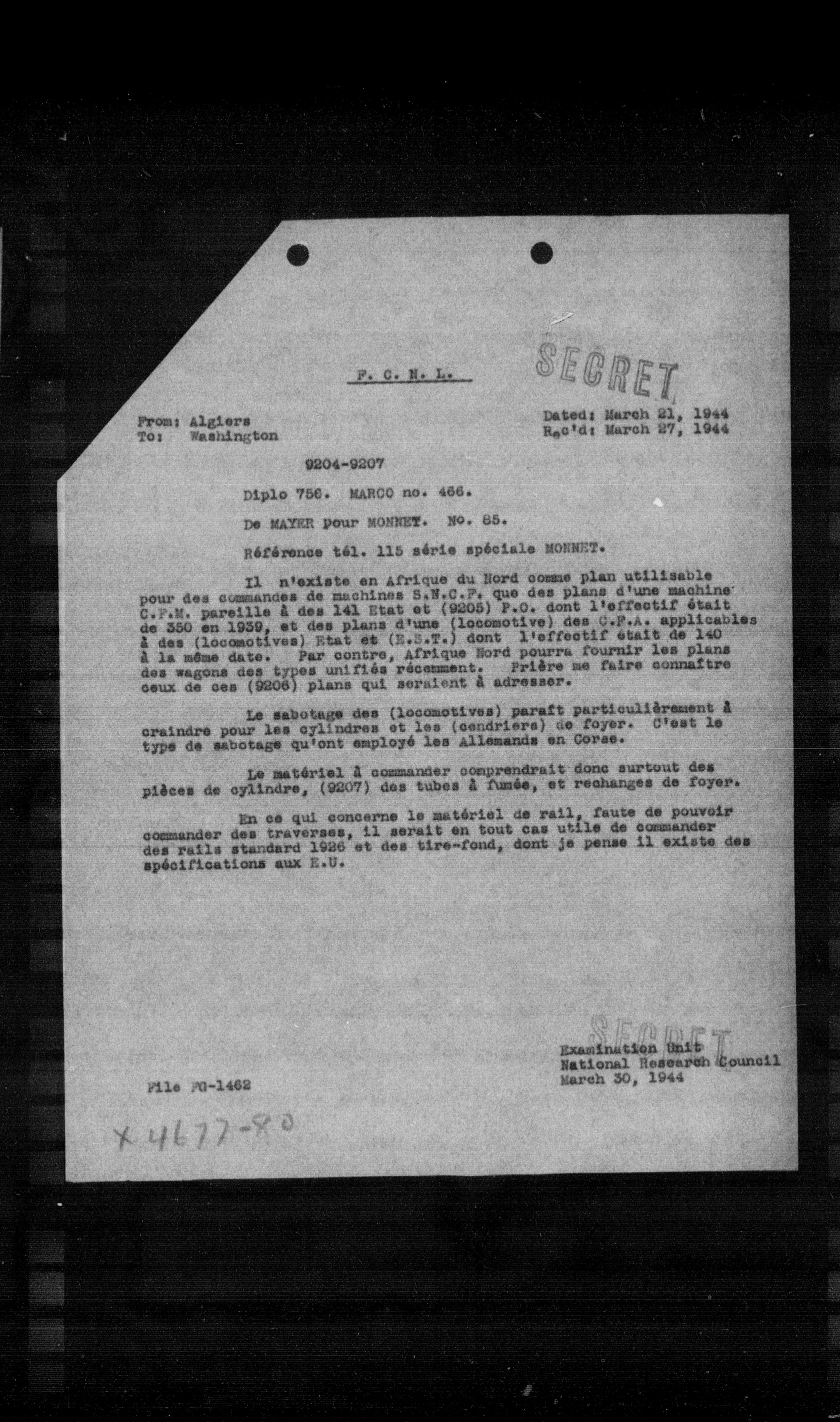 Il n'existe en Afrique du Nord comme plan utilisable pour des commanies de machines S.N.C.F. que des plans d'une machine C.F.E. pareille a des 141 Etat et (9205) P.C. dont l'effectif était de 350 en 1939, et des plans d'une (locomotive) des C.F.A. applioables a des (locomotives) Etat et (E.C.T.) dont l'effectif etait de 140 a la même date. Par contre, Afrique Nord pourra fournir les plans des wagons des types unifiés récemment. Prí̂re me faire connaitre ceux de ces (9206) plans qui seraient a adresser.