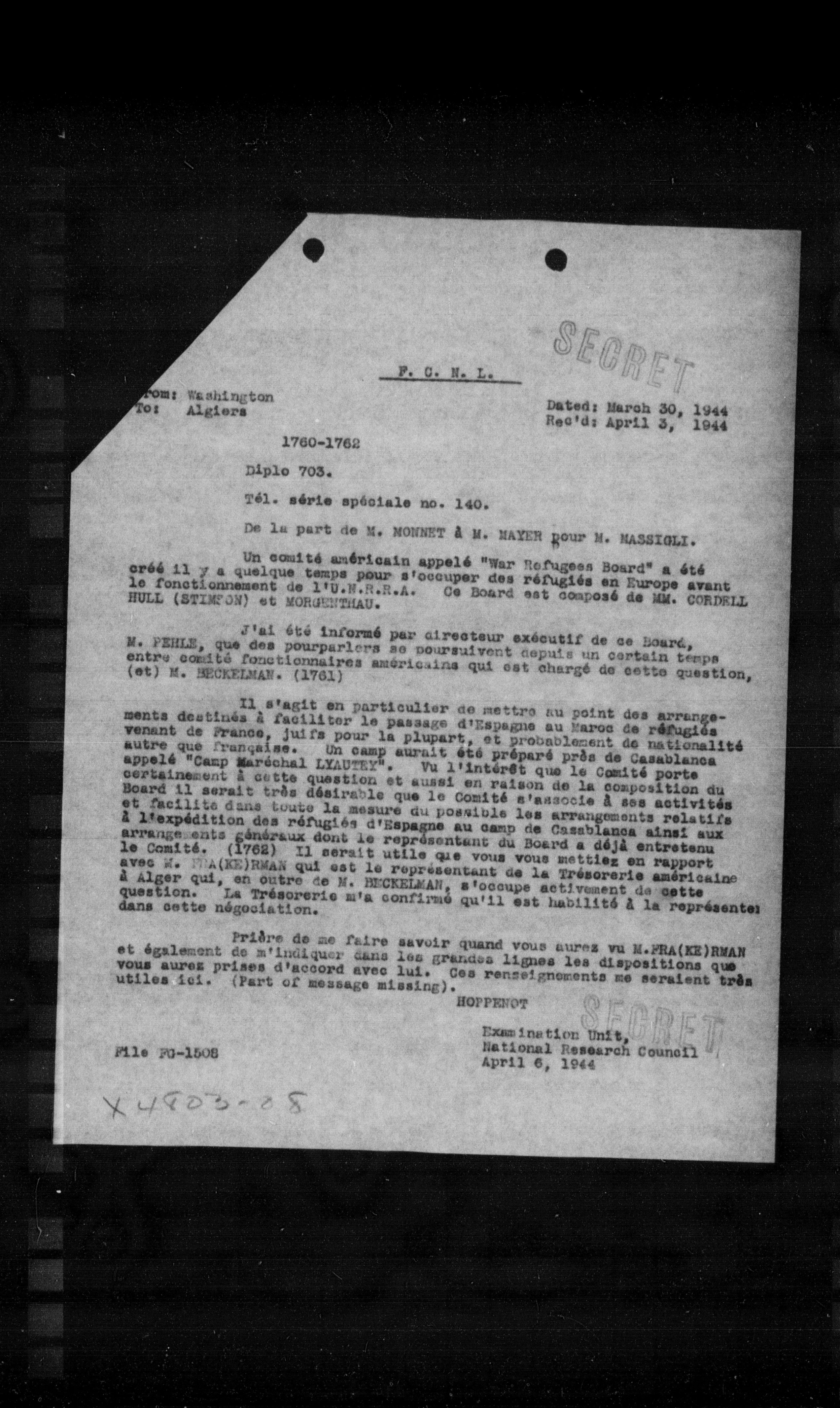Il s'agit en particulier de mettre au point des arrangements destinés à faciliter le passage d'Espagne au Maroc de réfugiés venant de France, juifs pour la plupart, et probablement de nationalité autre que française. Un camp aurait été préparé près de Casablanca appelé "Camp Maréchal LEADTET". Vu l'intérêt que le Comité porte certainement à cette question et aussi en raison de la composition du Board il serait très désirable que le Comité s'associe à ses activités et facilite dans toute la mesure du possible les arrangements relatifs à l'expédition des réfugiés d'Espagne au camp de Casablanca ainsi que les arrangements généraux dont le représentant du Board a déjà entretenu le Comité. (1762) Il serait utile que vous vous mettiez en rapport avec M. N.A.(EE)RMAN qui est le représentant de la Trésorerie américaine à Alger qui, en outre de M. NECKELMAN, s'occupe activement de cette question. La Trésorerie m'a confirmé qu'il est habilité à la représenter dans cette négociation.