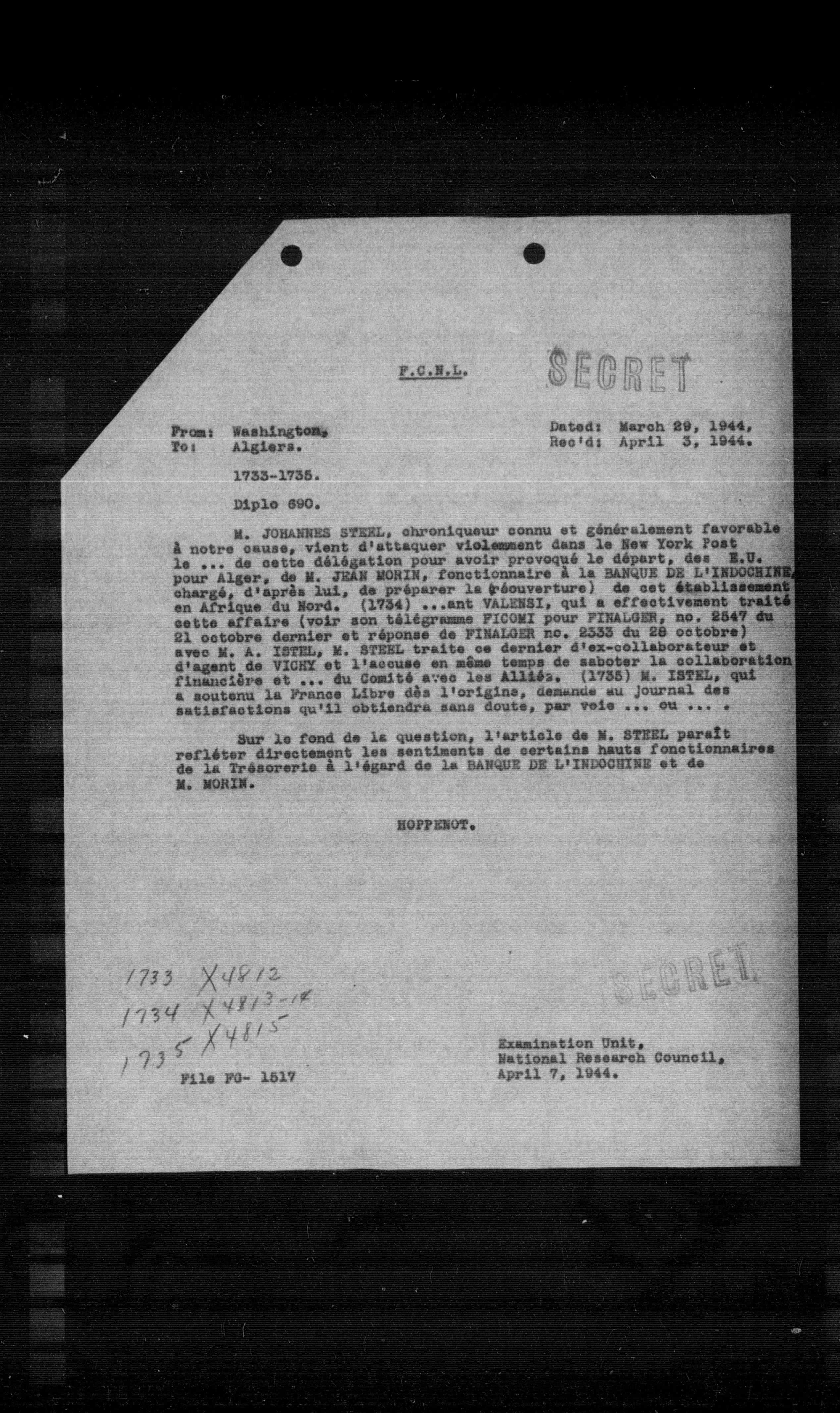 M. JOHANNES STEEL, chroniqueur connu et généralement favorable à notre cause, vient d'attaquer violemment dans le New York Post le ... de cette délégation pour avoir provoqué le départ, des I.I. pour Alger, de M. JEAN MORIN, fonctionnaire a la BANQUE DE L'INDOCHINE chargé, d'après lui, de préparer la f́́ouverture) de cet établissement en Afrique du Nord. (1734) ...ant VALENSI, qui a effectivement traité cette affaire (voir son télégramme PICONI pour FINALGER, no. 2547 du 21 octobre dernier et réponse de FINALGER no. 2533 du 28 octobre) avec M. A. ISTEL, M. STEEL traite ce dernier d'ex-collaborateur et d'agent de VICHY et l'accuse en même temps de saboter la collaboration financière et ... du Comite avec les Alliés. (1735) M. ISTEL, qui a soutenu la France Libre dès l'origine, demande au journal des satisfactions qu'il obtiendra sans doute, par voie ... ou ... .