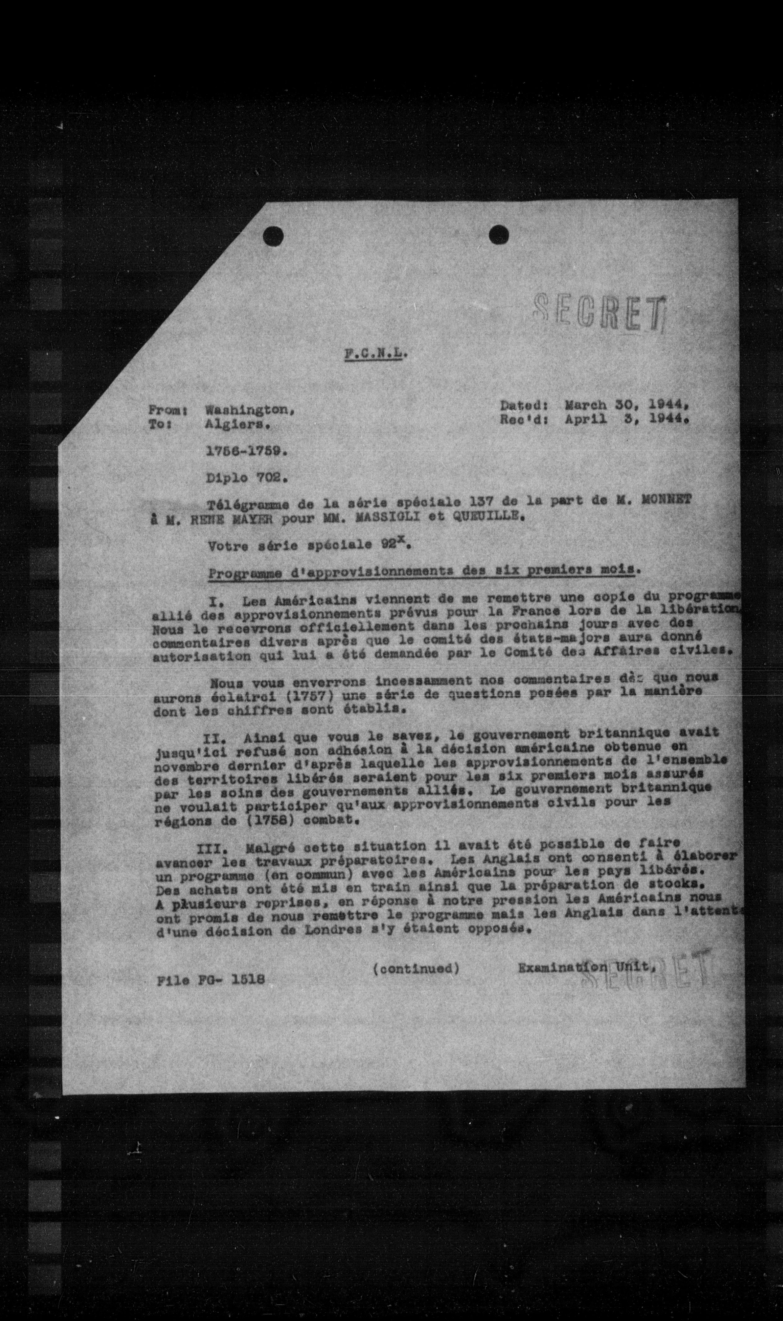 I. Les Américains viennent de me remettre une copie du programme allié des approvisionnements prévus pour la France lors de la libération. Nous le recevrons officiellement dans les prochains jours avec des commentaires divers après que le comité des états-majors aura donné autorisation qui lui a été demandée par le Comité des affaires civiles.