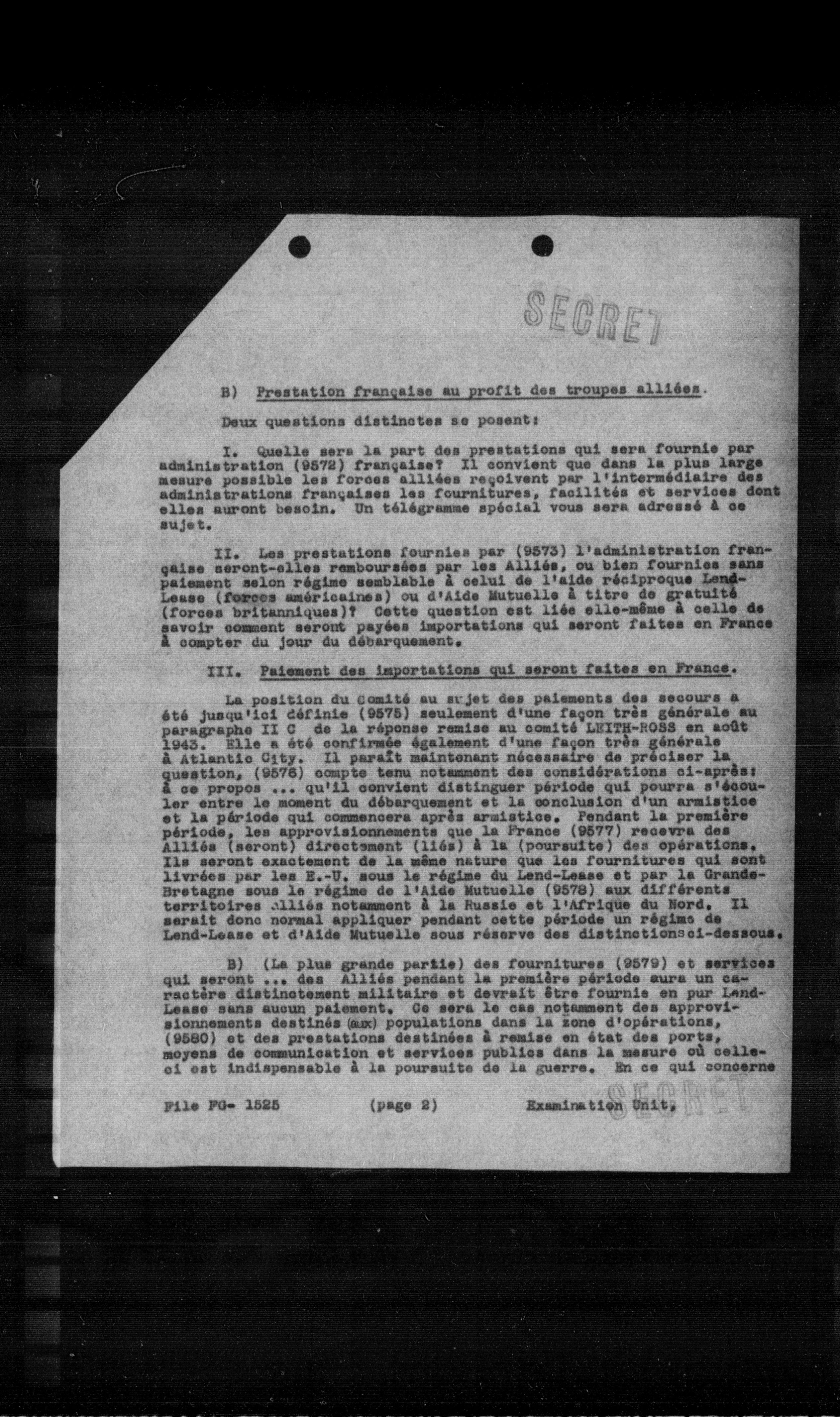 II. Les prestations fournies par (9573) l'administration française seront-elles remboursées par les Alliés, ou bien fournies sans paiement selon régime semblable à celui de l'aide réciproque LendLease (forces américaines) ou d'Aide Mutuelle à titre de gratuite (forces britanniques)? Cette question est liée elle-même à celle de savoir comment seront payées importations qui seront faites en France à compter du jour du débarquement.