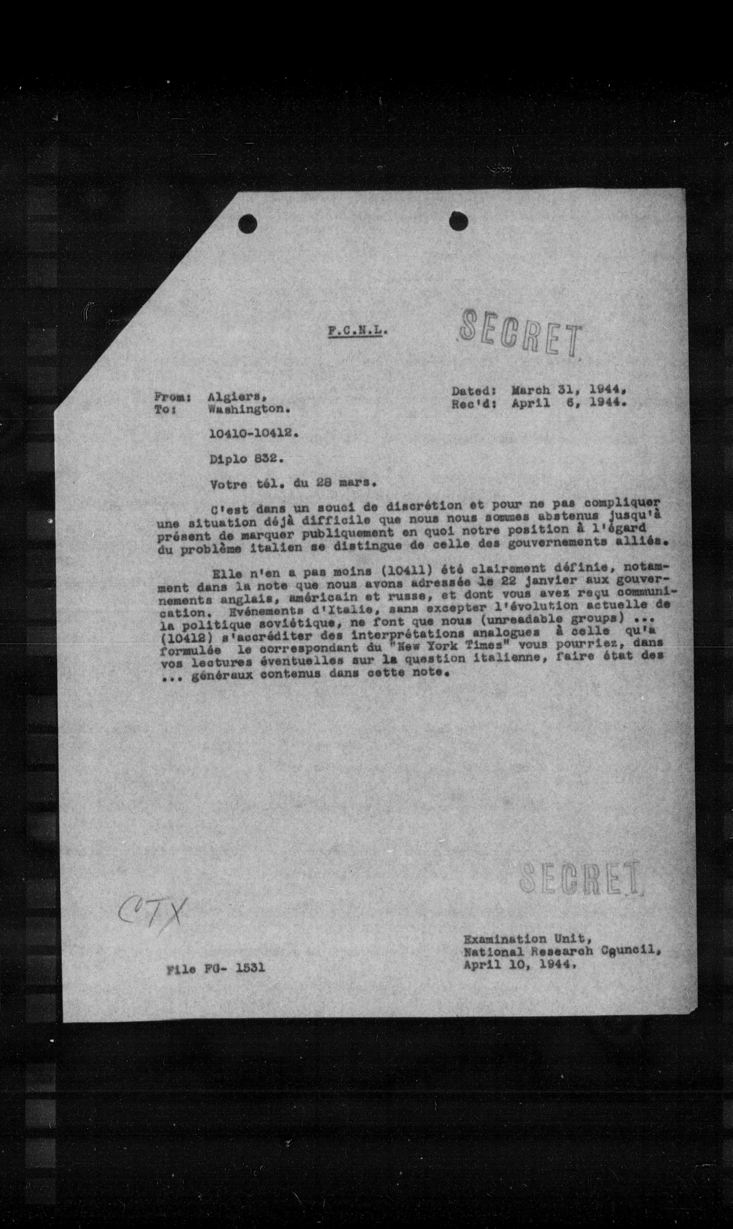 Elle n'en a pas moins (10411) été clairement définie, notamment dans la note que nous avons adressée le 22 janvier aux gouvernements anglais, américain et russe, et dont vous avez reçu a communi cation. Evénements d'Italle, sans excepter l'évolution actuelle de la politique soviétique, ne font que nous (unreadable groups) ... (10412) s'accréditer des interprétations analogues à celle qu'a formulée le correspondant du "New York Times" vous pourriez, dans vos lectures éventuelles sur la question italienne, faire état des ... généraux contenus dans cette note.