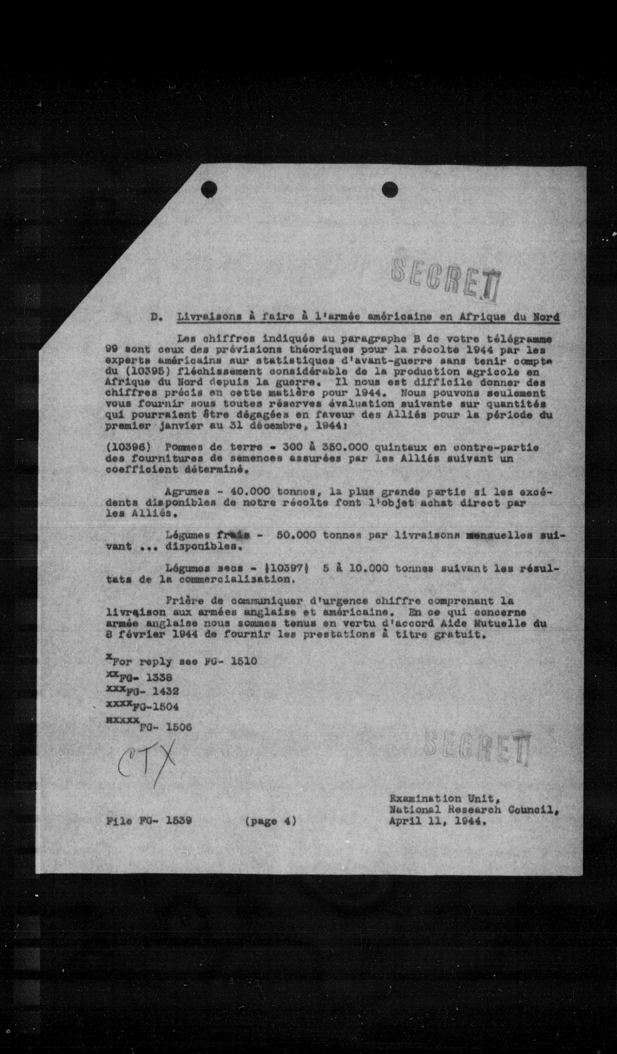 Les chiffres indiqués au paragraphe B de votre télégreame 99 sont ceux des prévisions théoriques pour la récolte 1944 par les experts américains sur statistiques d'avant-guerre sans tenir compte du (10395) fléchissement considérable de la production agricole en Afrique du Nord depuis la guerre. Il nous est difficile donner des chiffres précis en cette matière pour 1944. Nous pouvons seulement vous fournir sous toutes réserves évaluation suivante sur quantités qui pourraient être dégagées en faveur des Alliés pour la période du premier janvier au 31 décembre, 1944:
