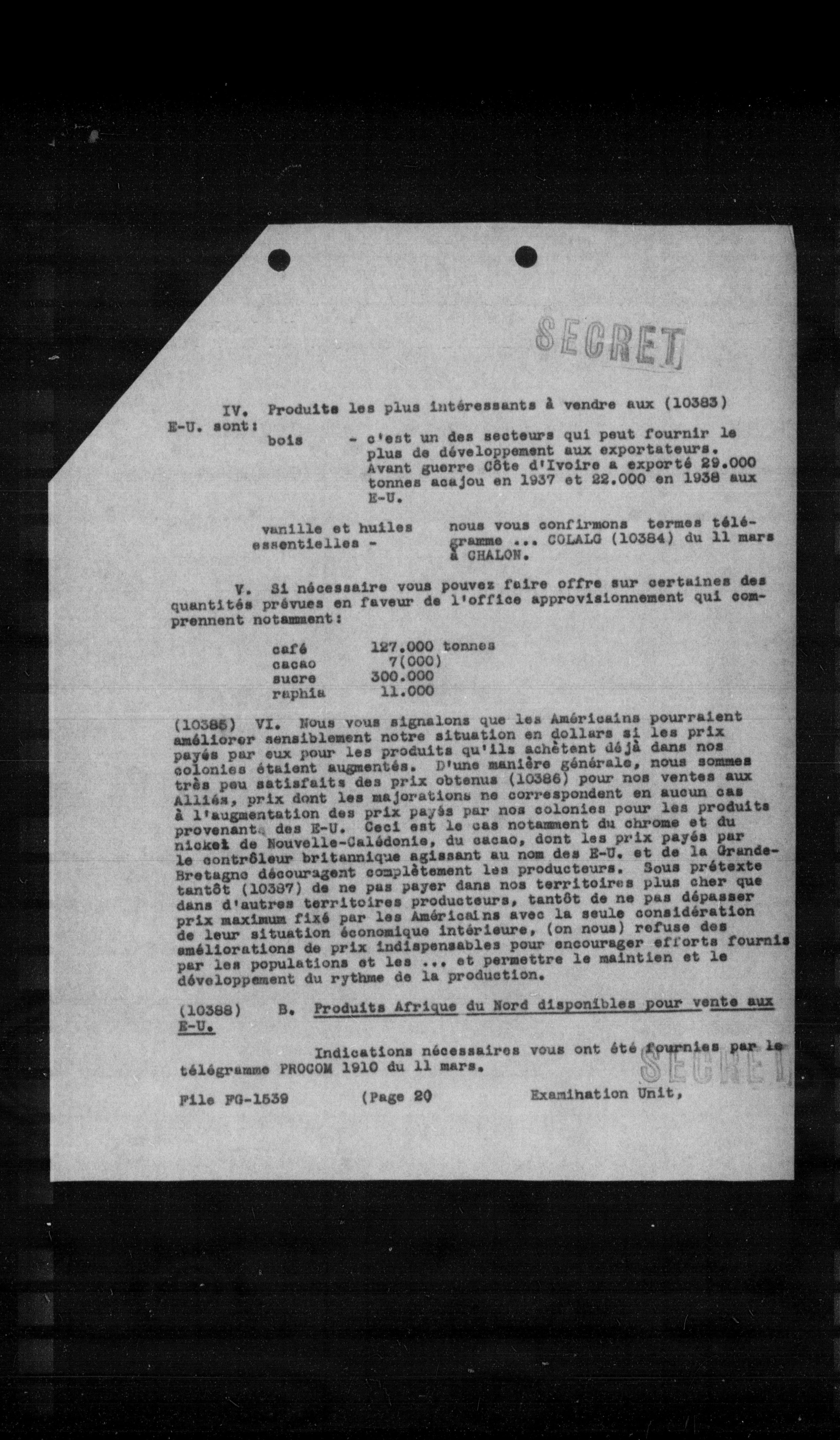 (10385) VI. Nous vous signalons que les Américains pourraient améliorer sensiblement notre situation en dollars si les prix payés par eux pour les produits qu'ils achètent déjà dans nos colonies étaient augmentés. D'une manière générale, nous sommes très peu satisfaits des prix obtenus (10386) pour nos ventes aux Alliés, prix dont les majorations ne correspondent en aucun cas à l'augmentation des prix payés par nos colonies pour les produits provenant des E-U. Ceci est le cas notamment du chrome et du nickel de Nouvelle-Calédonie, du cacao, dont les prix payés par le contrôleur britannique agissant au nom des E-U. et de la Grande-Bretagne découragent complètement les producteurs. Sous prétexte tantôt (10387) de ne pas payer dans nos territoires plus cher que dans d'autres territoires producteurs, tantôt de ne pas dépasser prix maximum fixé par les Américains avec la seule considération de leur situation économique intérieure, (on nous) refuse des améliorations de prix indispensables pour encourager efforts fournis par les populations et les ... et permettre le maintien et le développement du rythme de la production.